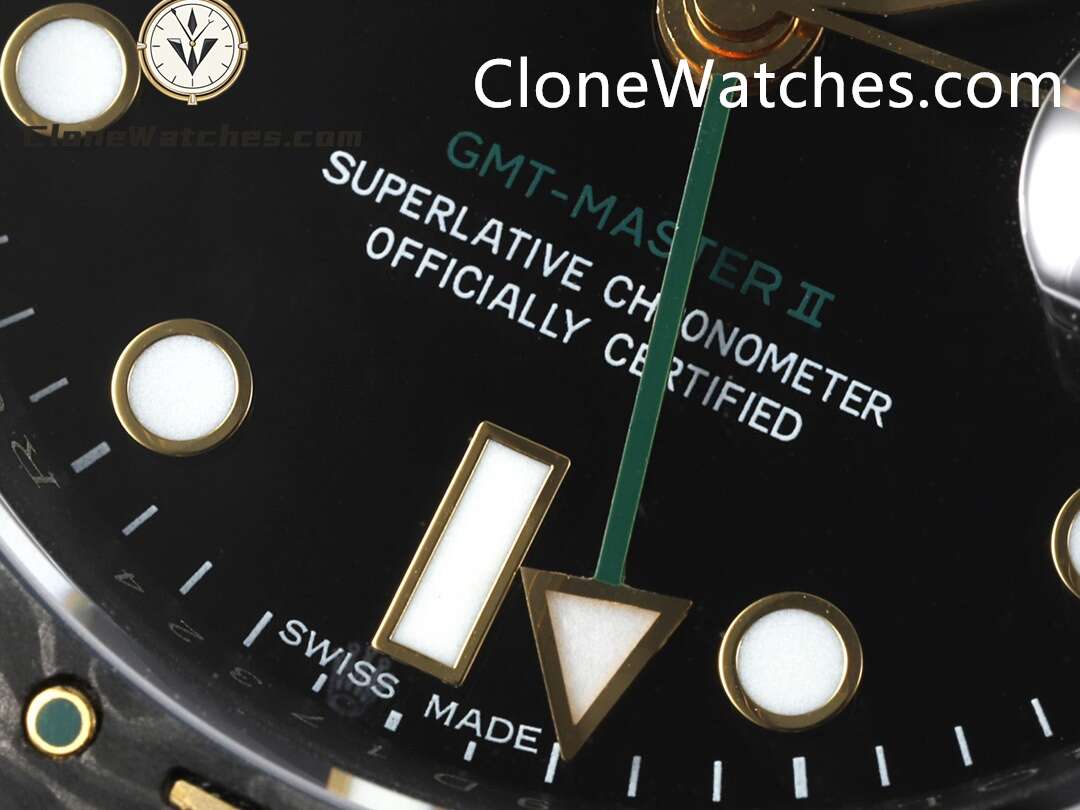 Diw Rolex GMT Master II Super Clone Watches uses Clone 3285 movement, and makes a carbon fiber case. The bezel, dial and other parts are also made of carbon fiber. The digital scale on the carbon fiber bezel uses the new carbon fiber planting technology (non-oil filling) for the first time to create a rich visual level and delicate texture.