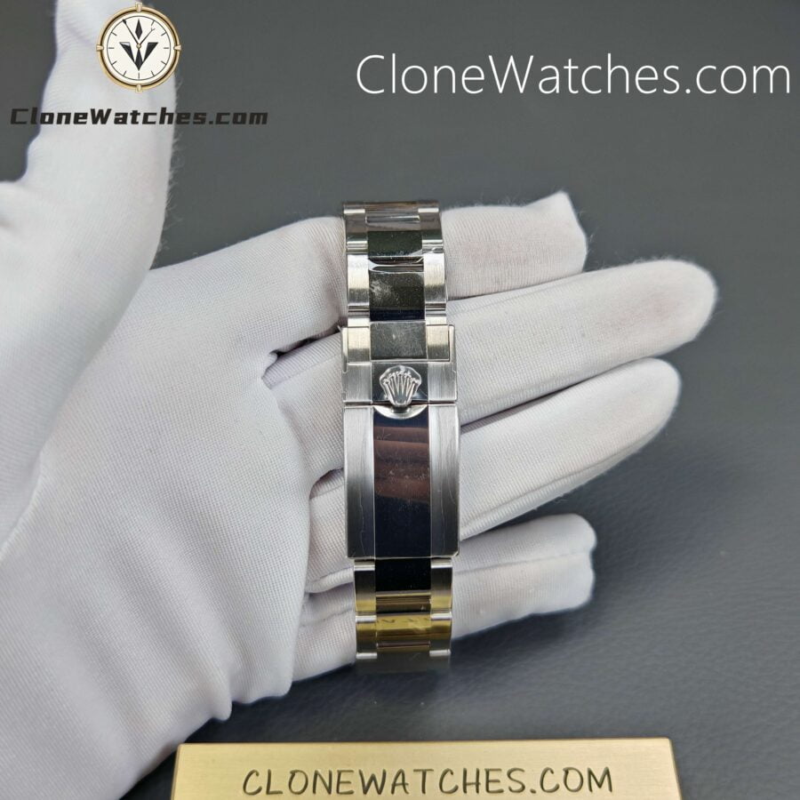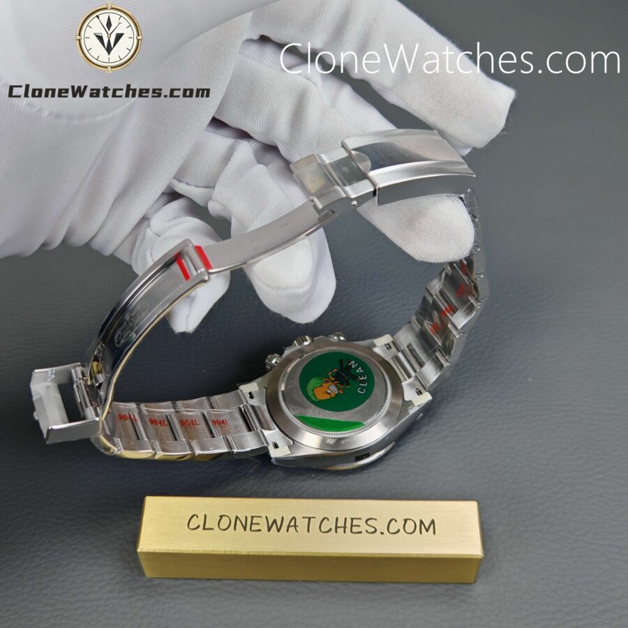 The overall tone of Rolex Daytona M116520-78590 Super Clone Watches is white, and the white dial looks very plain. For the functions, the 3 o’clock position is a 30-minute chronograph small dial, the 9 o’clock position is a 12-hour chronograph small dial, and the 6 o’clock position is a small disc for the second hand. The overall scale of the Clone Watches, including the luminous bar, is relatively smooth, and there will be no embarrassing pits in the past. The outer ring uses black scales, which can prevent the watch from being oxidized later to a certain extent, and cause the embarrassing situation of gray. This is also the reason why many customers pursue steel Daytona. The white lettering is matched with the gray function circle with a strong three-dimensional sense, which also makes the overall watch have a certain sense of gradient. The disk is still 3D printed English, and our photos can also be seen very clearly. The color of the three small disks on the disk is mainly modified, and the CD pattern on the outer ring is more delicate, which is more beautiful!