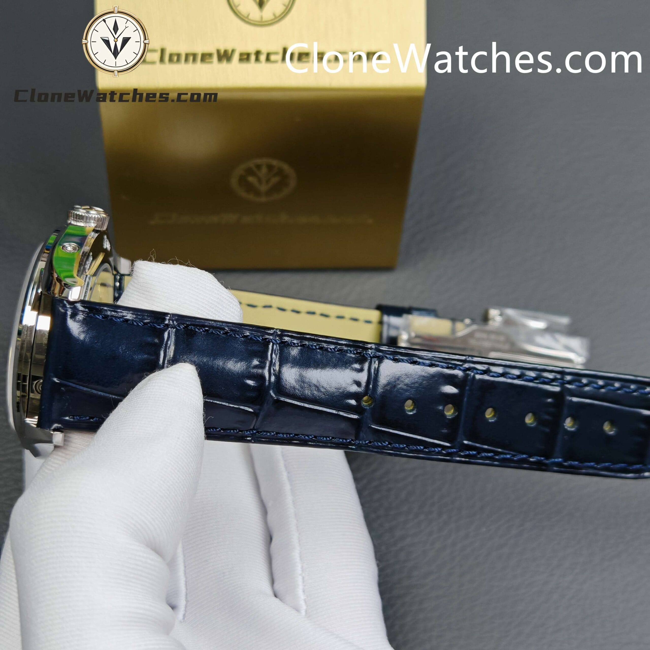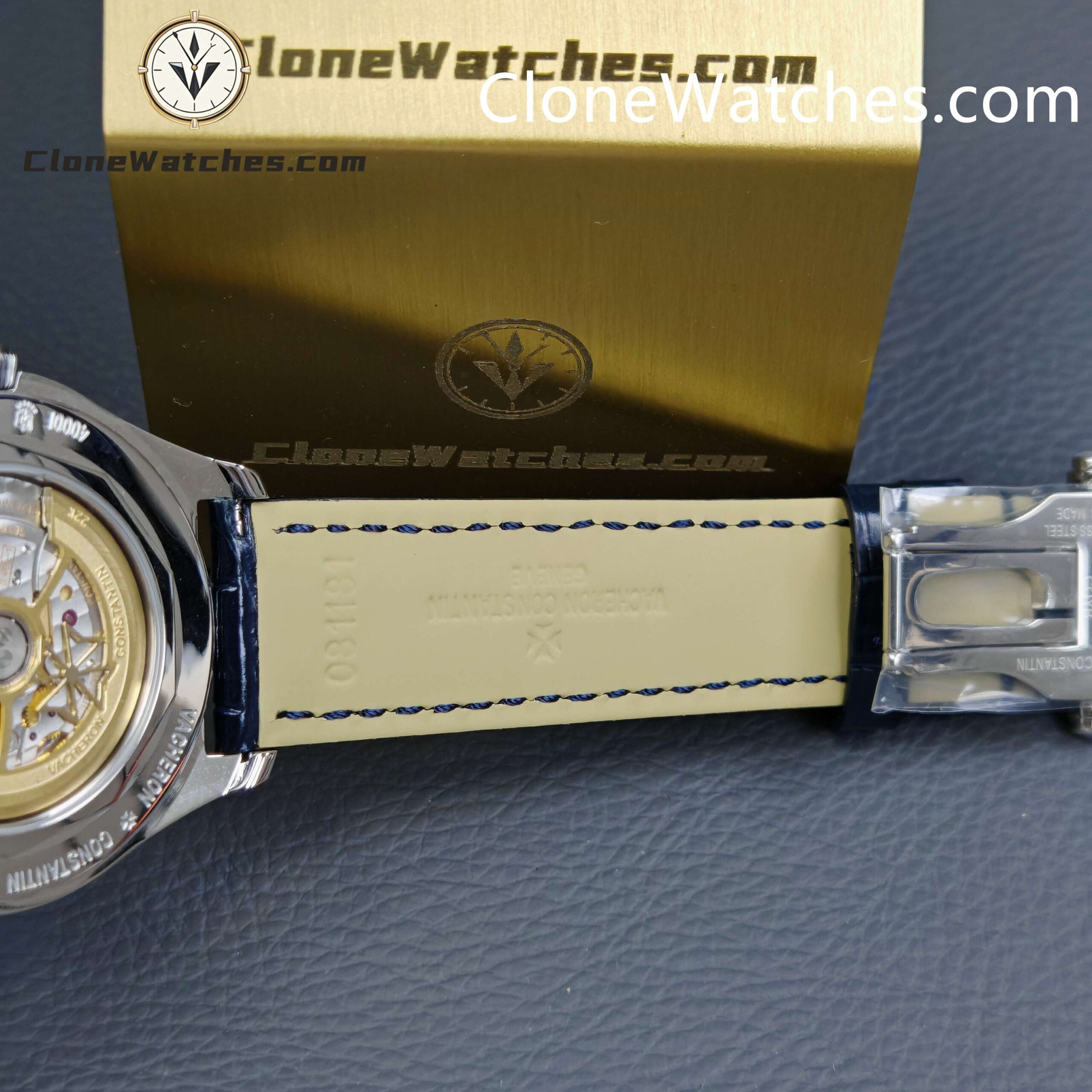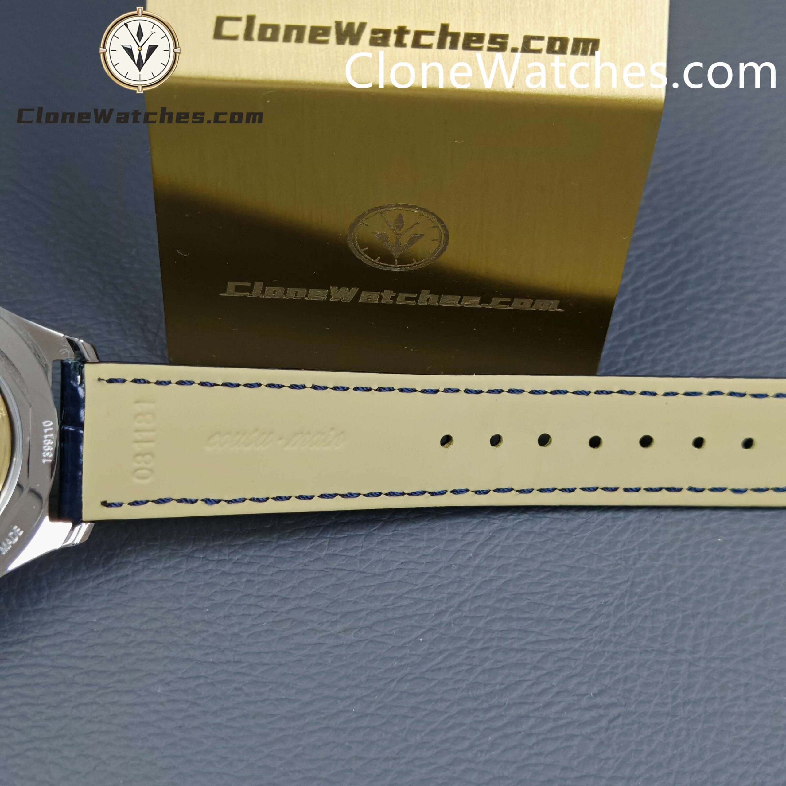 [Model] 4000E/000A-B548 [Case] Clone Watches Size 40mm×11.6mm, truly synchronized with the original. The screw-in crown and the unique box-shaped sapphire crystal mirror improve wear resistance and durability while retaining the retro charm of Fiftysix. [Dial] Two rectangular windows at 12 o’clock can display the day of the week and the month respectively. The date display is located on the outer edge of the dial and is indicated by a blue pointer with an arrow. The moon phase display at 6 o’clock is composed of a blue night sky and a platinum moon. The scale ring is equipped with platinum Arabic numerals and bar-shaped hour markers, which complement the deep moon phase disk. [Movement] Striving for perfection at all costs, it took 18 months to develop a new 2460 Q/1 automatic winding movement, which perfectly corrected the shortcomings①The balance wheel position is consistent with the original