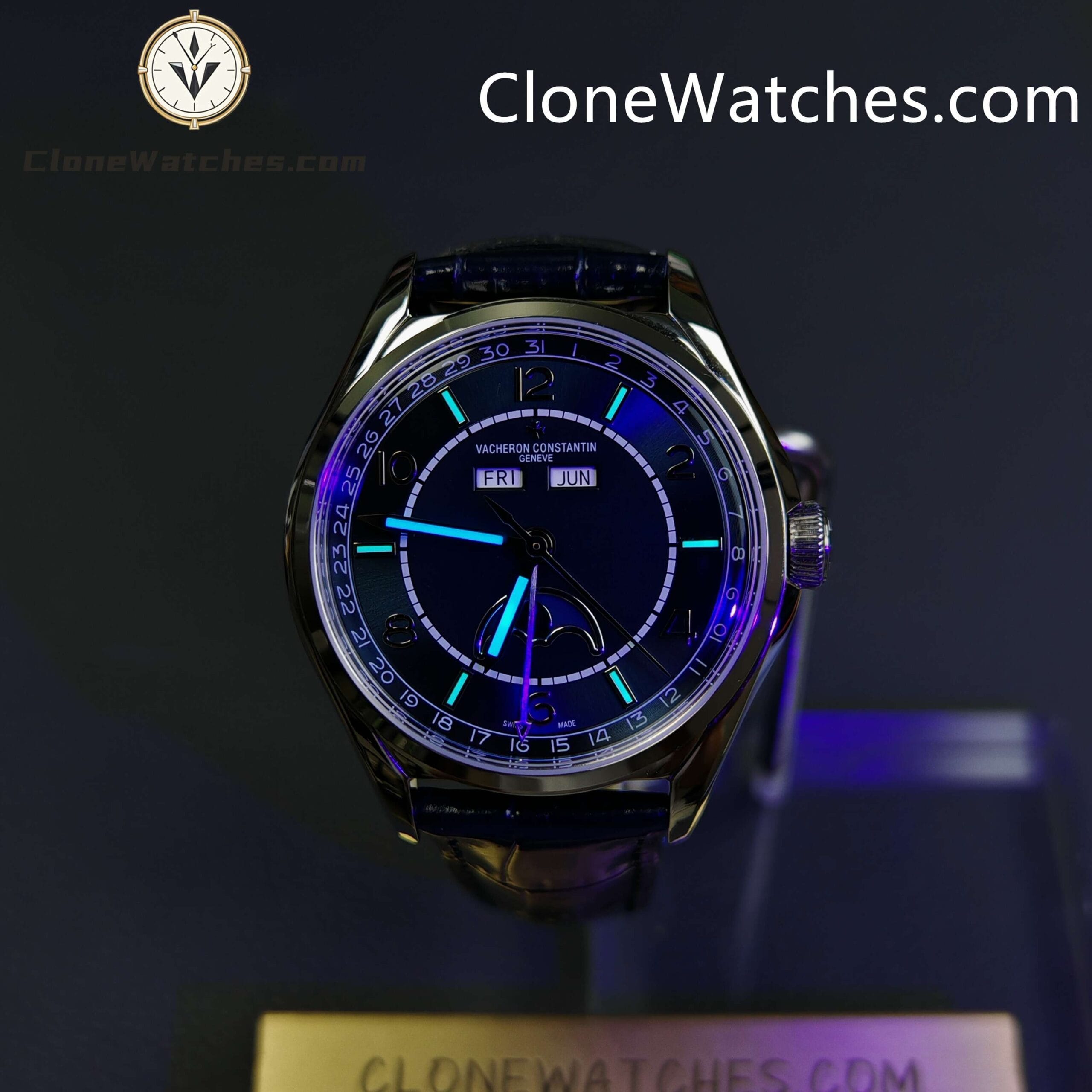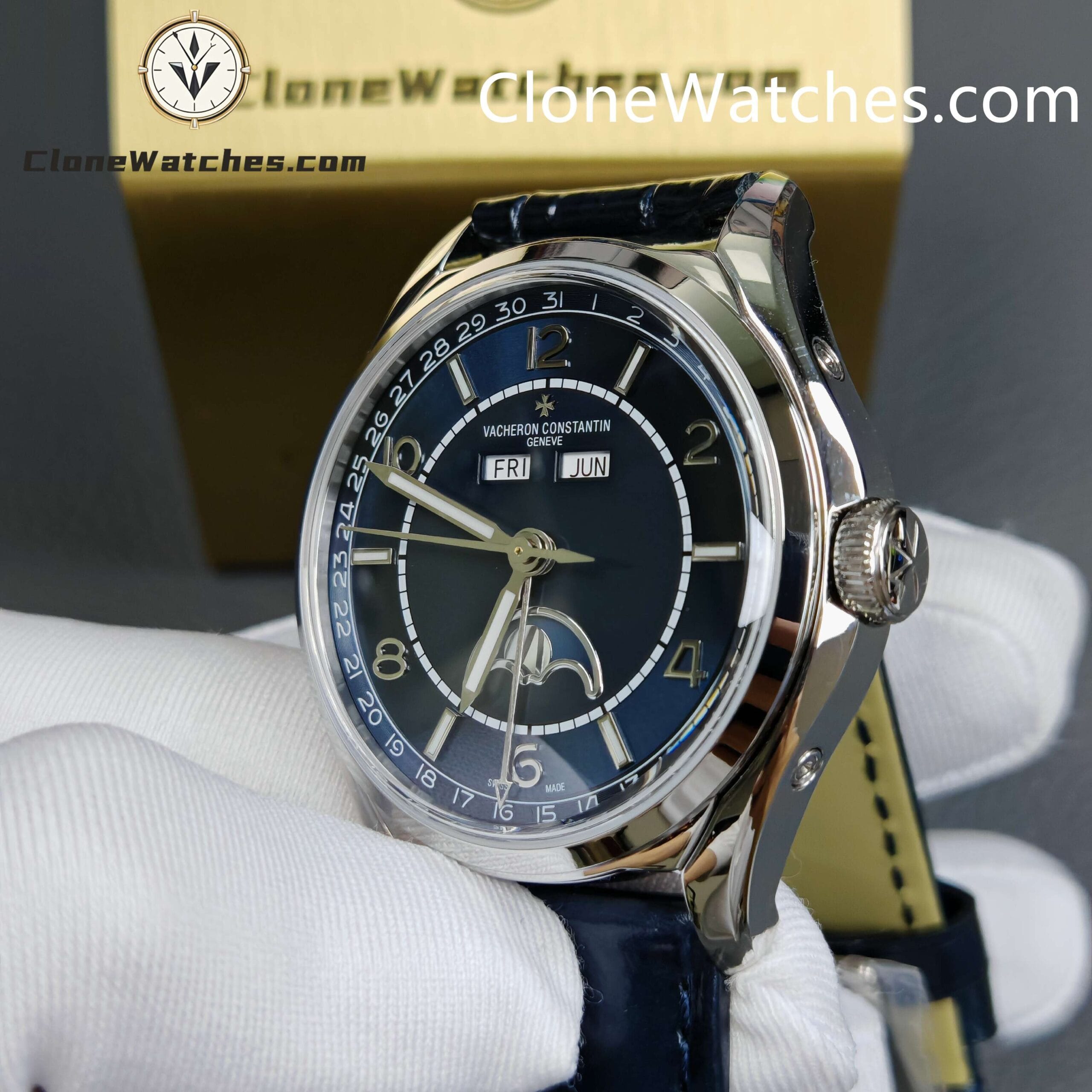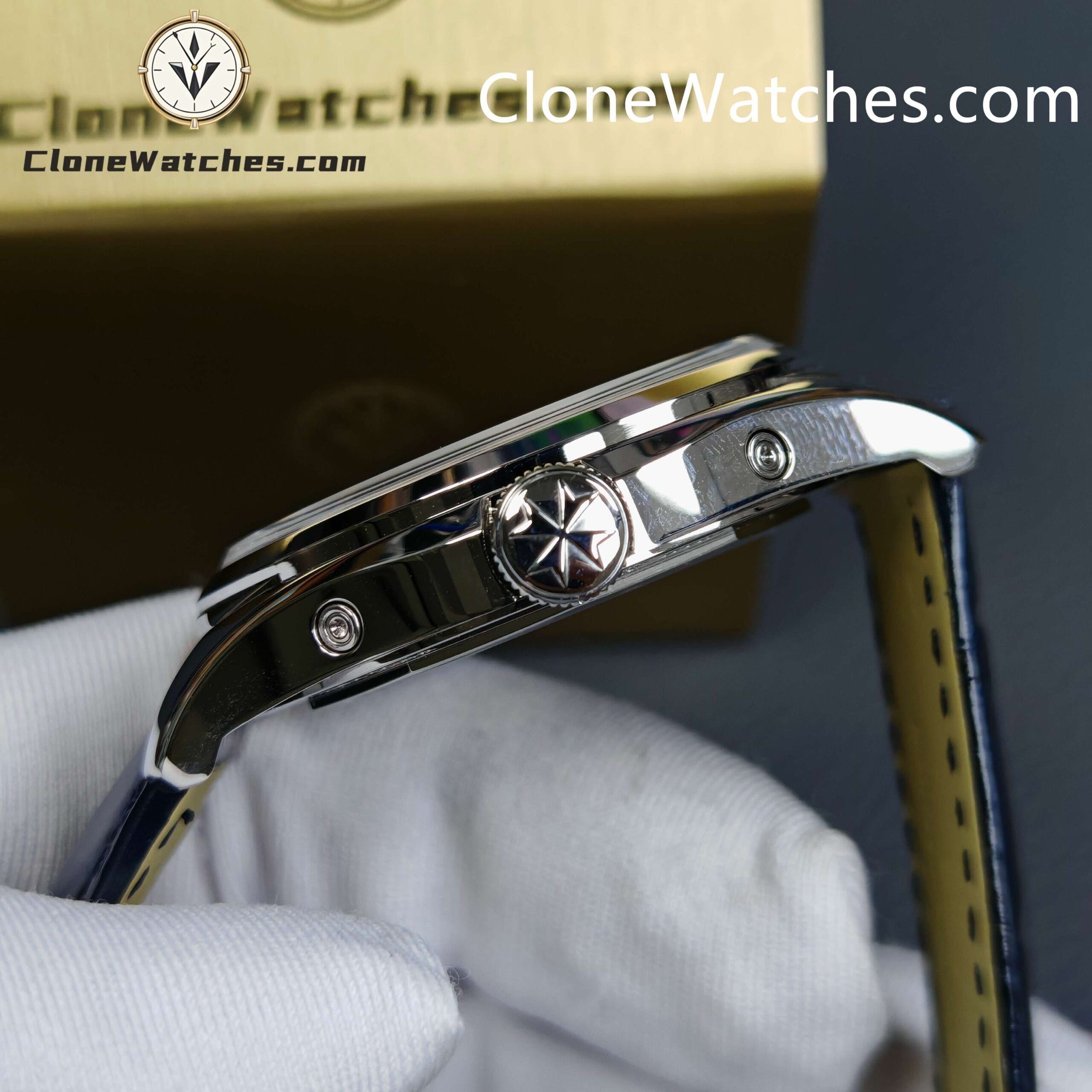 [Model] 4000E/000A-B548 [Case] Clone Watches Size 40mm×11.6mm, truly synchronized with the original. The screw-in crown and the unique box-shaped sapphire crystal mirror improve wear resistance and durability while retaining the retro charm of Fiftysix. [Dial] Two rectangular windows at 12 o’clock can display the day of the week and the month respectively. The date display is located on the outer edge of the dial and is indicated by a blue pointer with an arrow. The moon phase display at 6 o’clock is composed of a blue night sky and a platinum moon. The scale ring is equipped with platinum Arabic numerals and bar-shaped hour markers, which complement the deep moon phase disk. [Movement] Striving for perfection at all costs, it took 18 months to develop a new 2460 Q/1 automatic winding movement, which perfectly corrected the shortcomings①The balance wheel position is consistent with the original