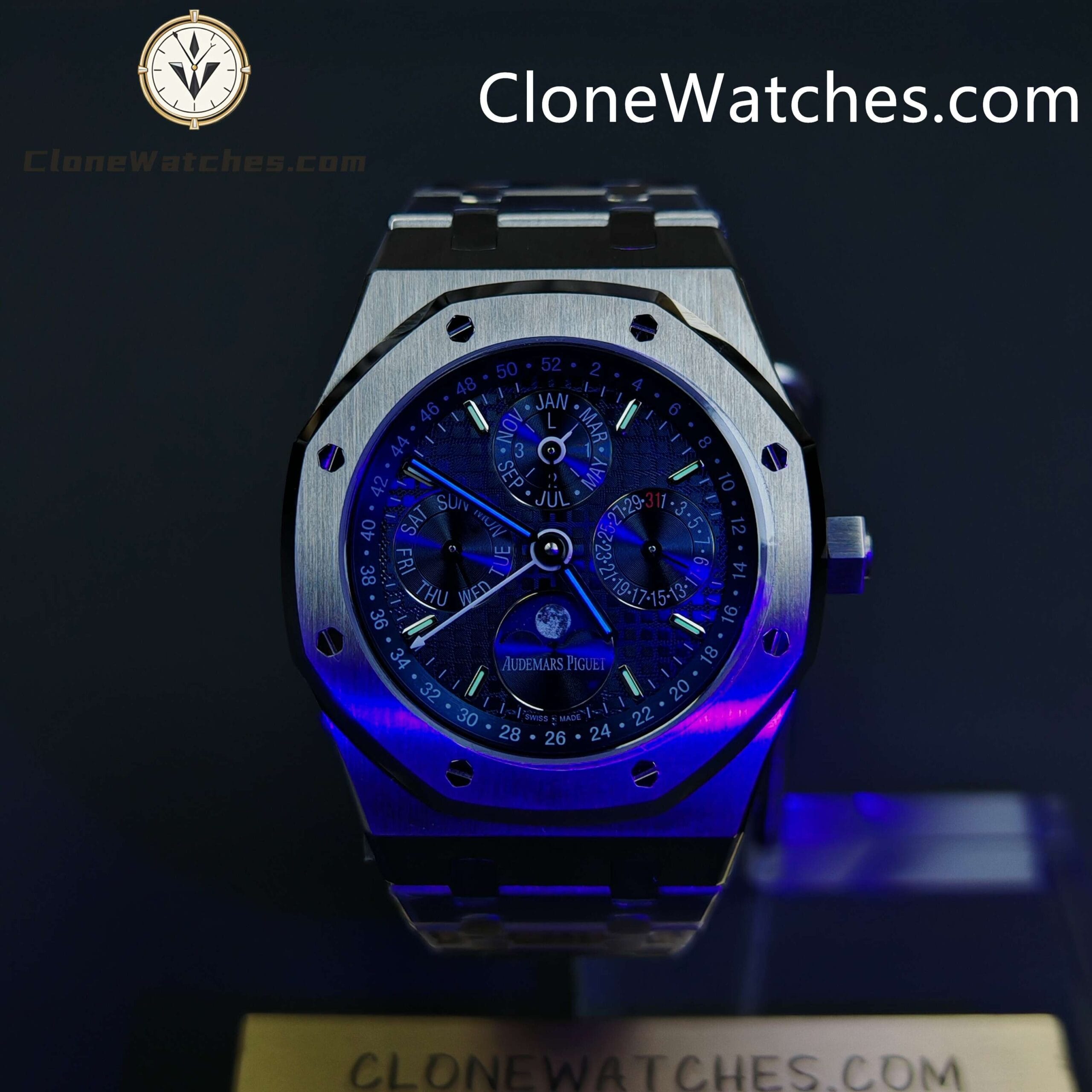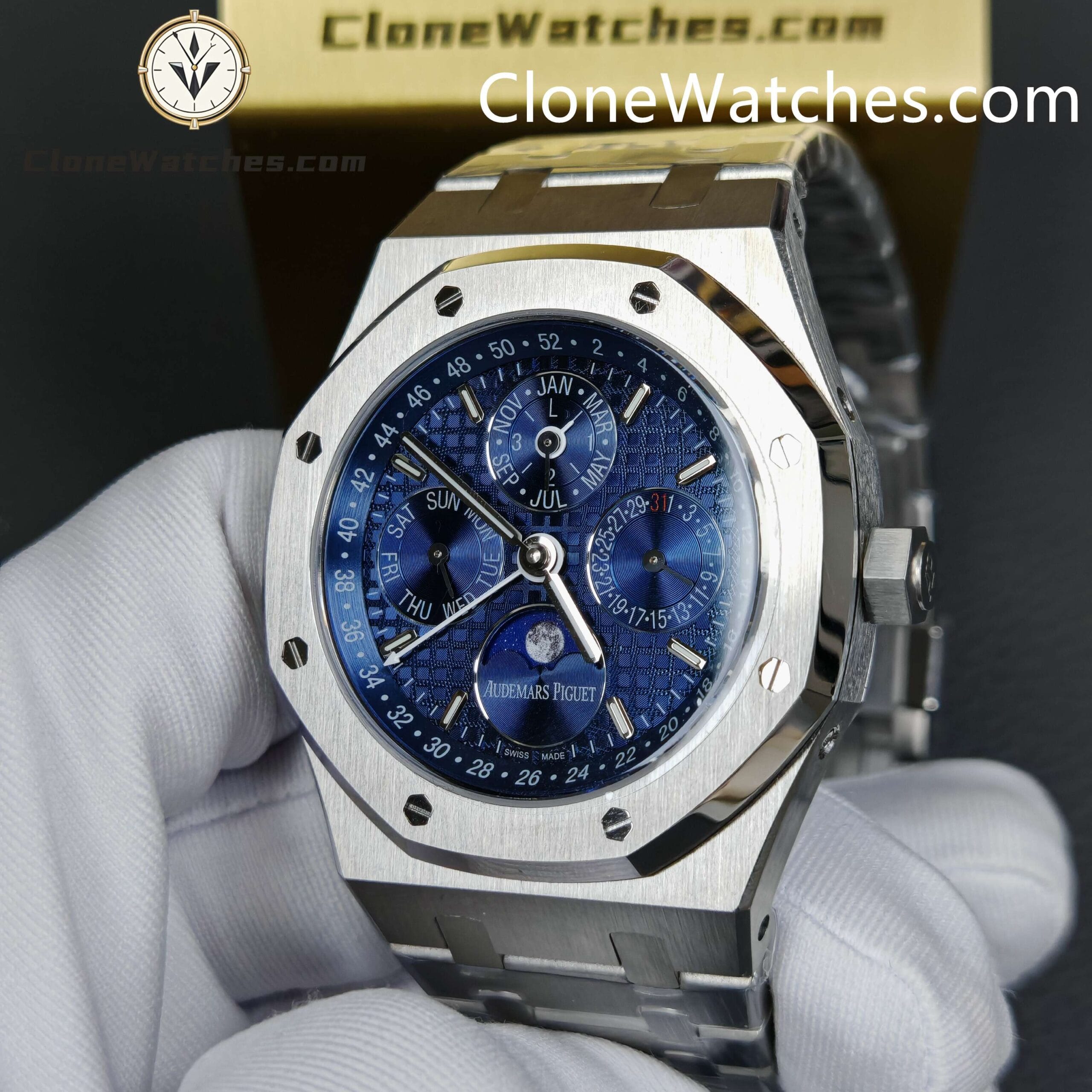 Audemars Piguet Royal Oak Perpetual Calendar, with a noble and elegant blue dial and a cool stainless steel case, perfectly reflects Audemars Piguet’s aesthetic design and the high technology of complex functions.