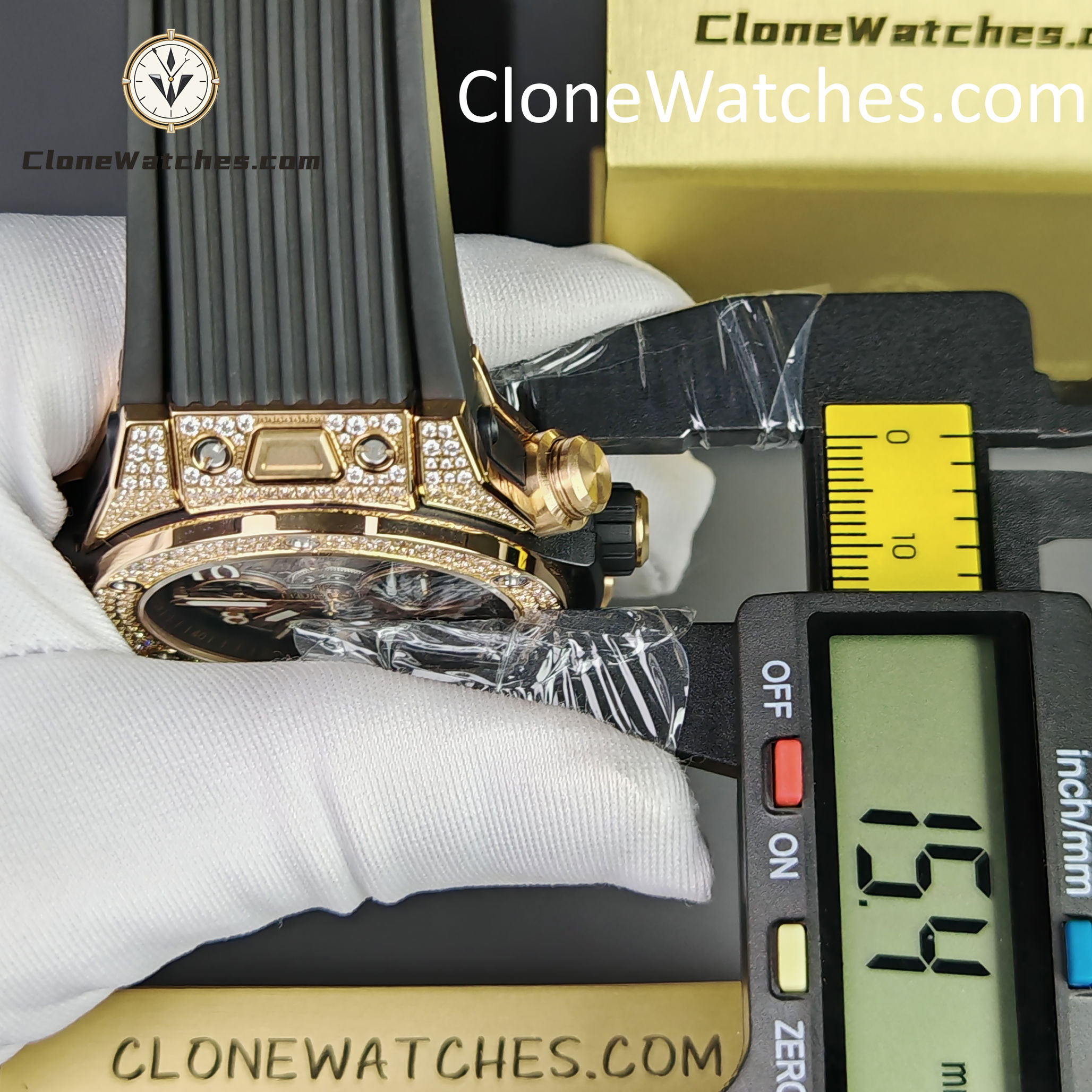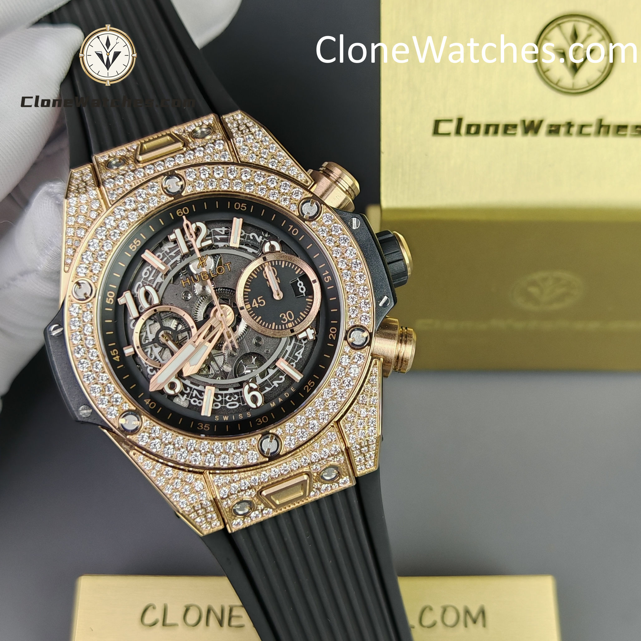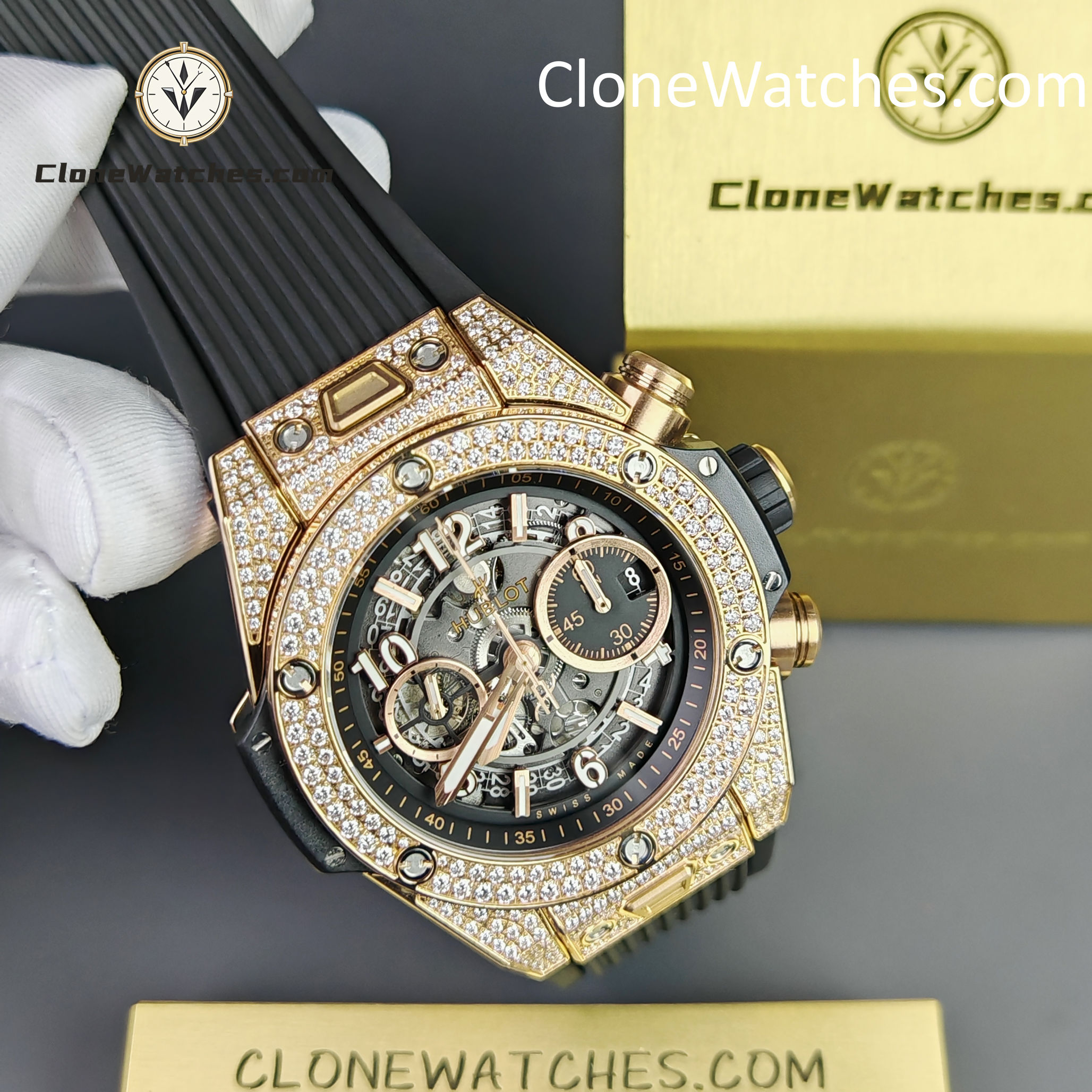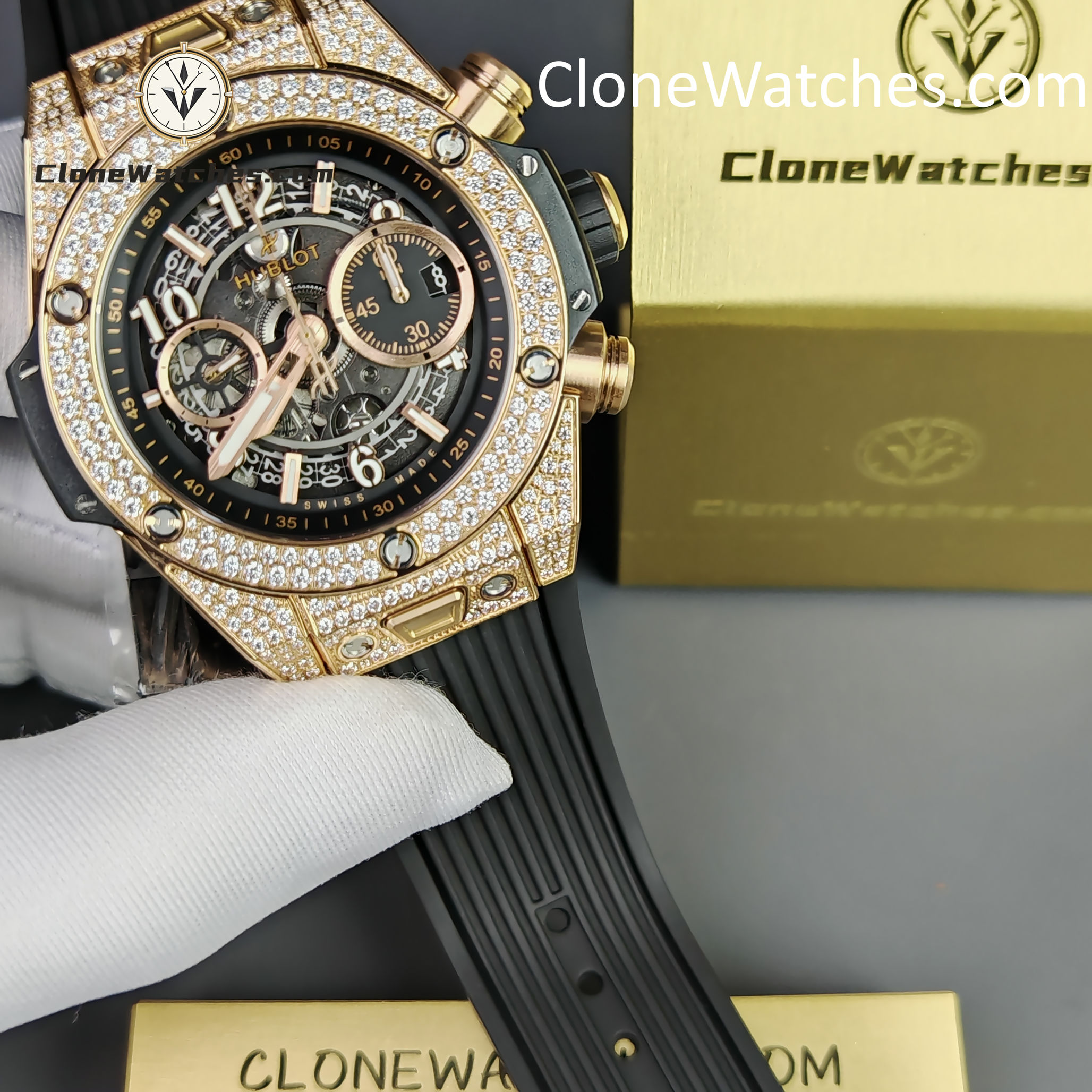 - Case & Band: 42mm King Gold Plated (Pavé Set) / Quick-Change Rubber
