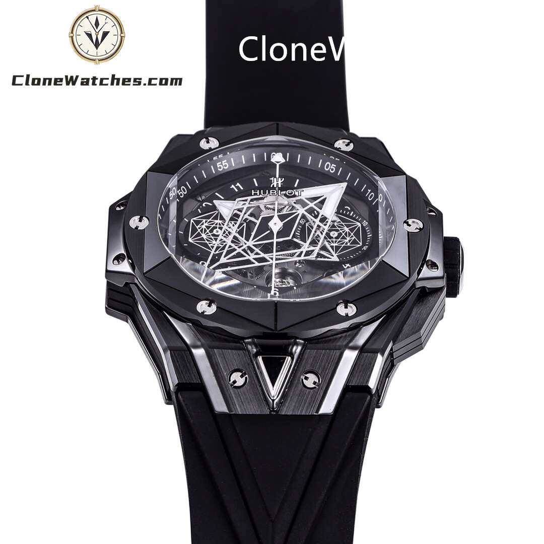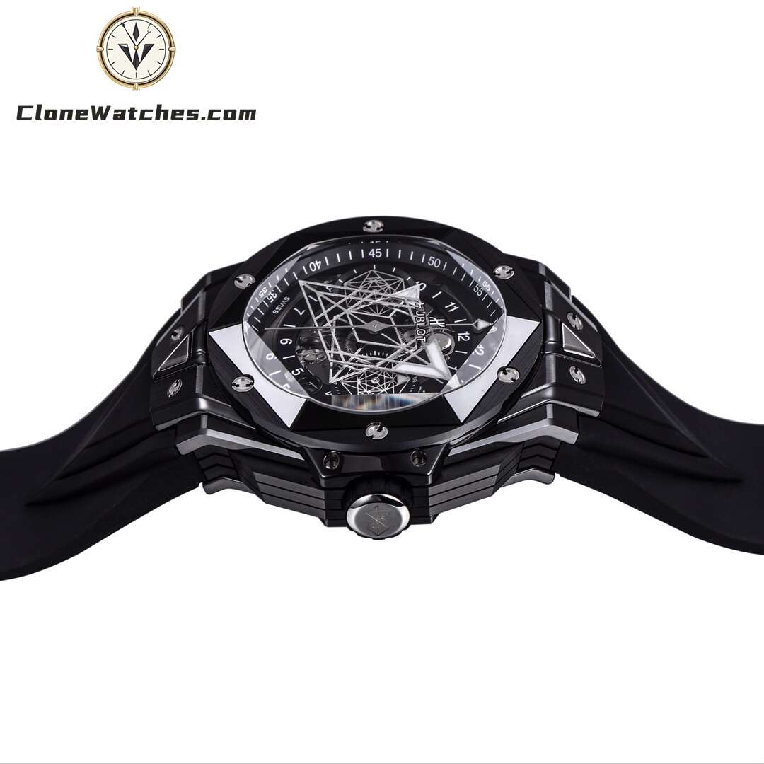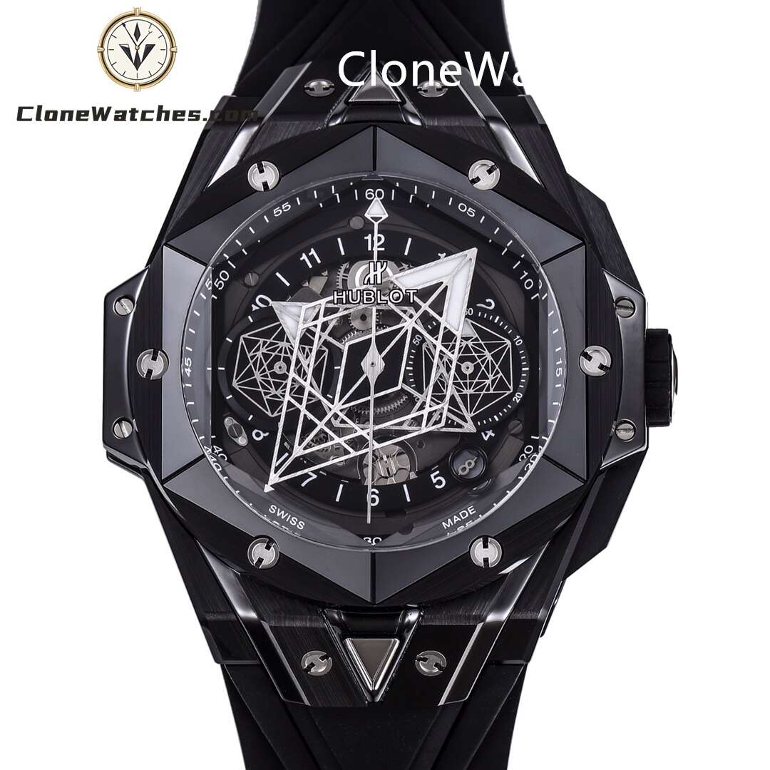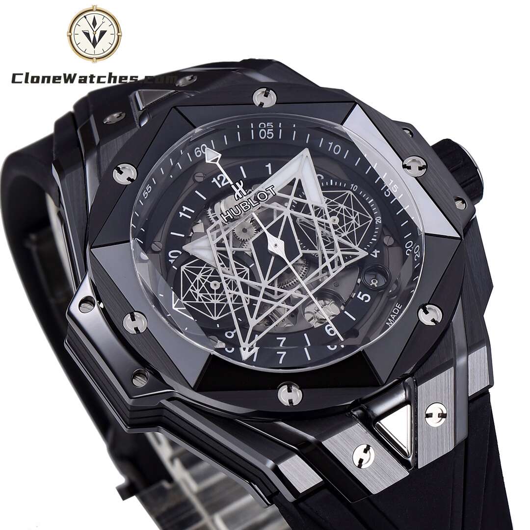 Clone Watches The case is made of up to 12 pieces of ceramic material. After polishing, satin, slicing, engraving, chamfering and faceting, it presents alternating hexagons, rhombuses and triangles, creating a harmonious and charming visual effect. Standard customized Hublot exclusive UNICO HUB 1240 automatic flyback chronograph movement, perfectly realized 4.5-digit hollow calendar ring and window, 3-digit 60-minute timing, 8-digit horizontal clutch, 9-digit small second wheel.