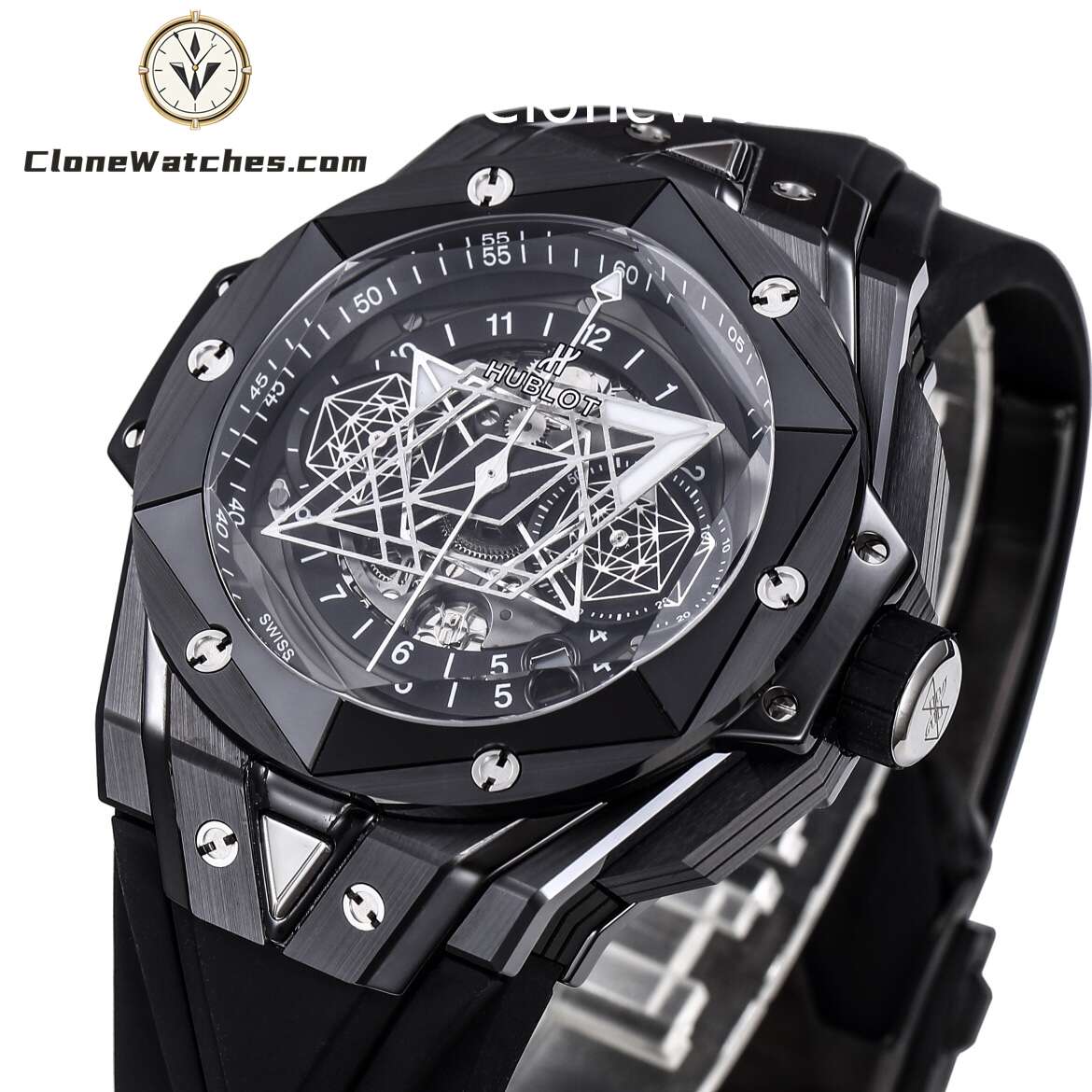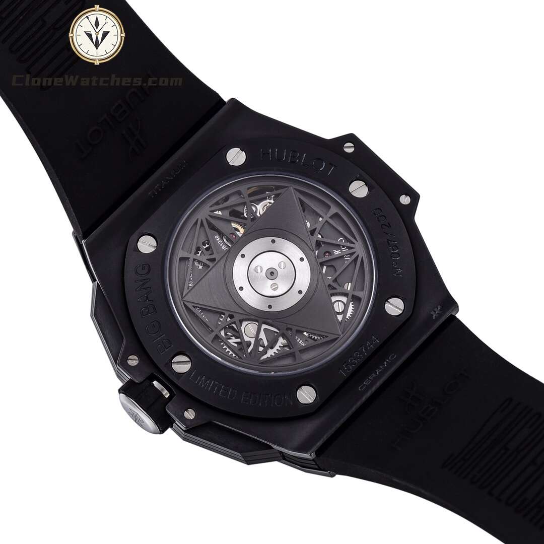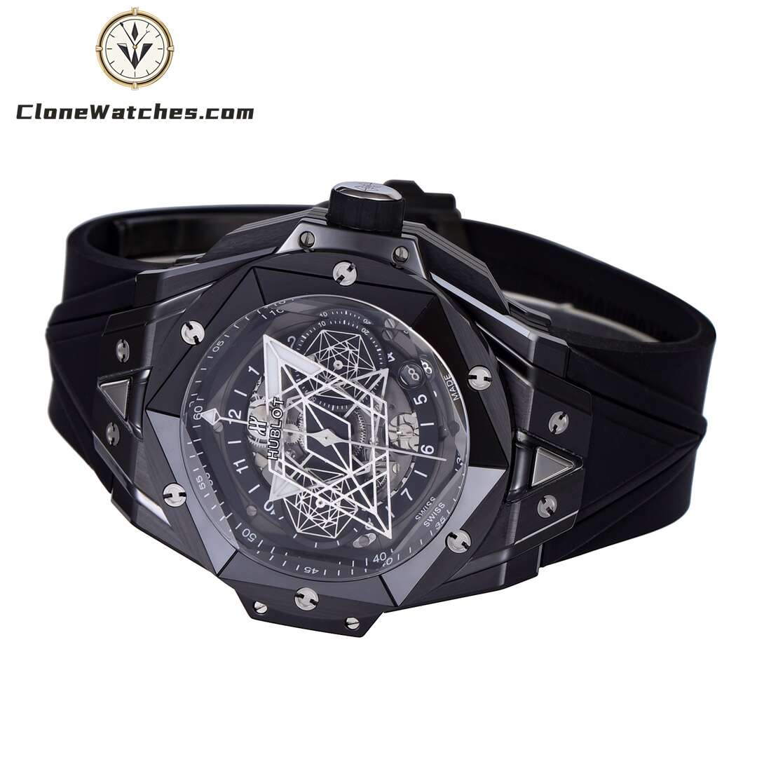 Clone Watches The case is made of up to 12 pieces of ceramic material. After polishing, satin, slicing, engraving, chamfering and faceting, it presents alternating hexagons, rhombuses and triangles, creating a harmonious and charming visual effect. Standard customized Hublot exclusive UNICO HUB 1240 automatic flyback chronograph movement, perfectly realized 4.5-digit hollow calendar ring and window, 3-digit 60-minute timing, 8-digit horizontal clutch, 9-digit small second wheel.