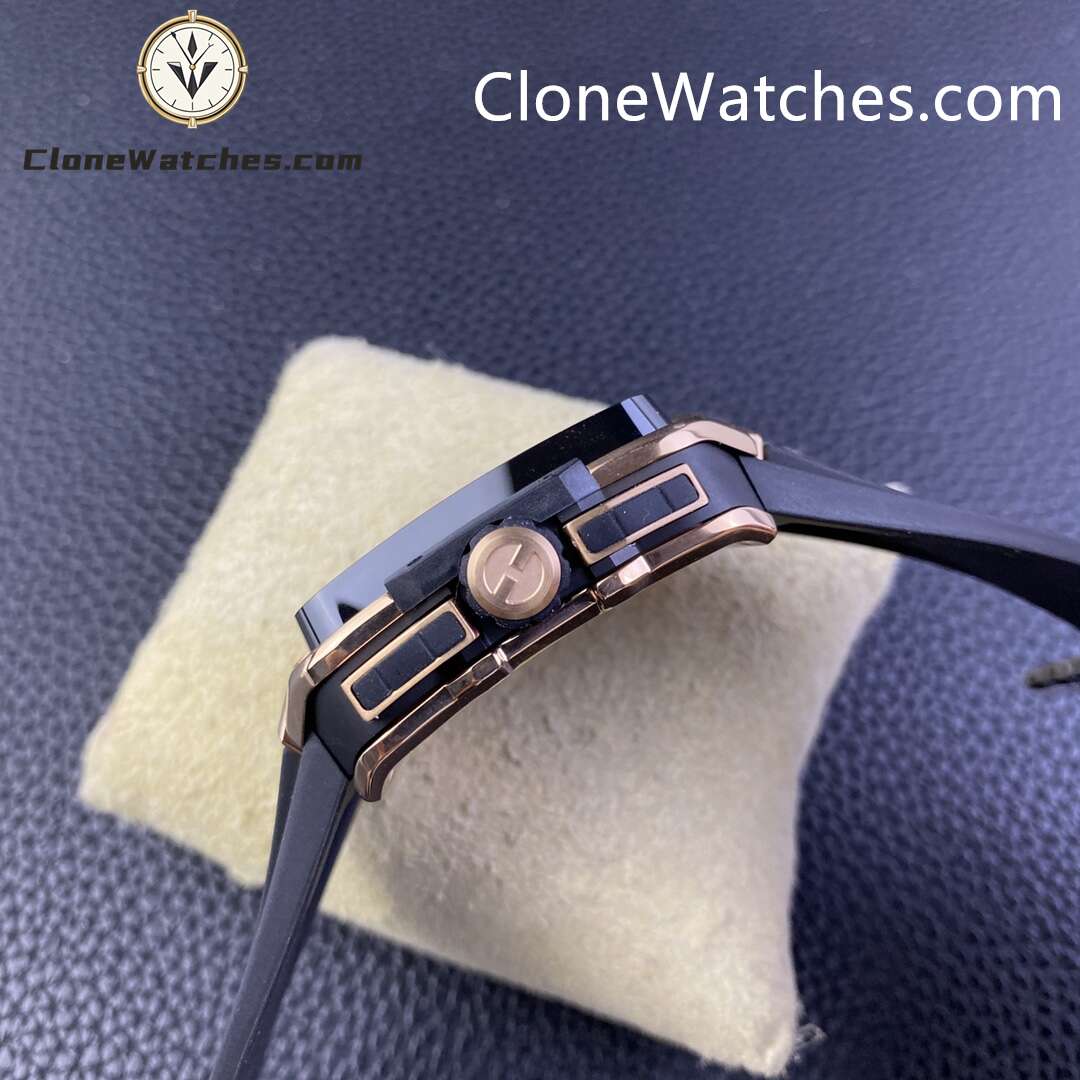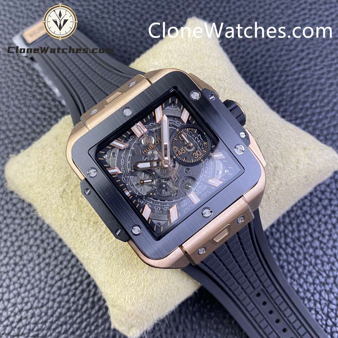 Hublot Square Bang Unico King Gold Ceramic Super Clone Watches uses highly transparent sapphire, literally upper and lower bridge-shaped sapphire, and adopts a textured rubber strap derived from the Big Bang series and a one-button quick release system that has been highly praised by the market. The Clone Watches uses the HUB1280 movement, with a clearly visible column wheel at the 6 o’clock position. The fully hollow calendar ring and double chronograph display design replace the traditional dial, and the mystery of the operation of the internal movement can be seen at a glance.