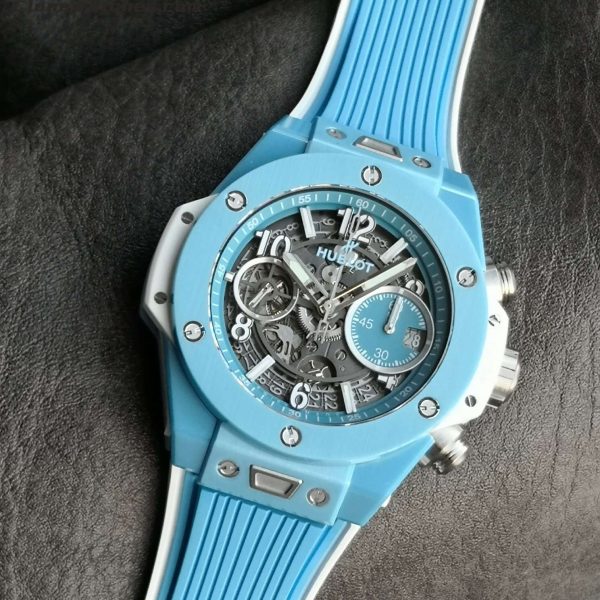 - Case & Band: 42mm Solid Sky Blue Ceramic