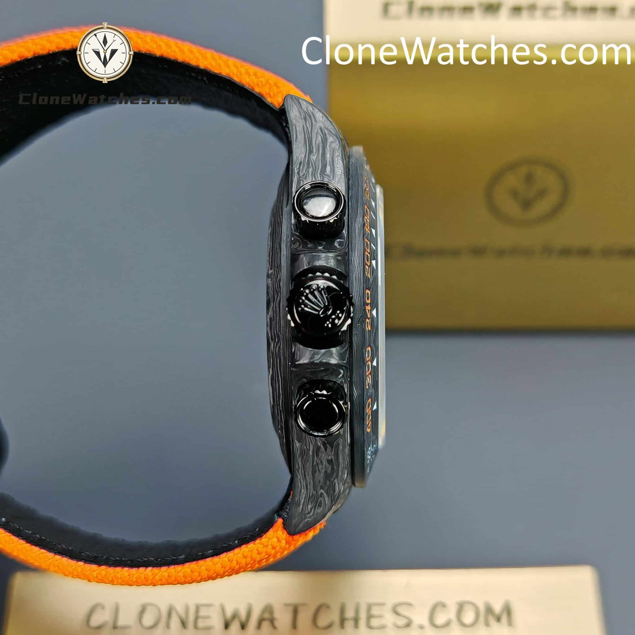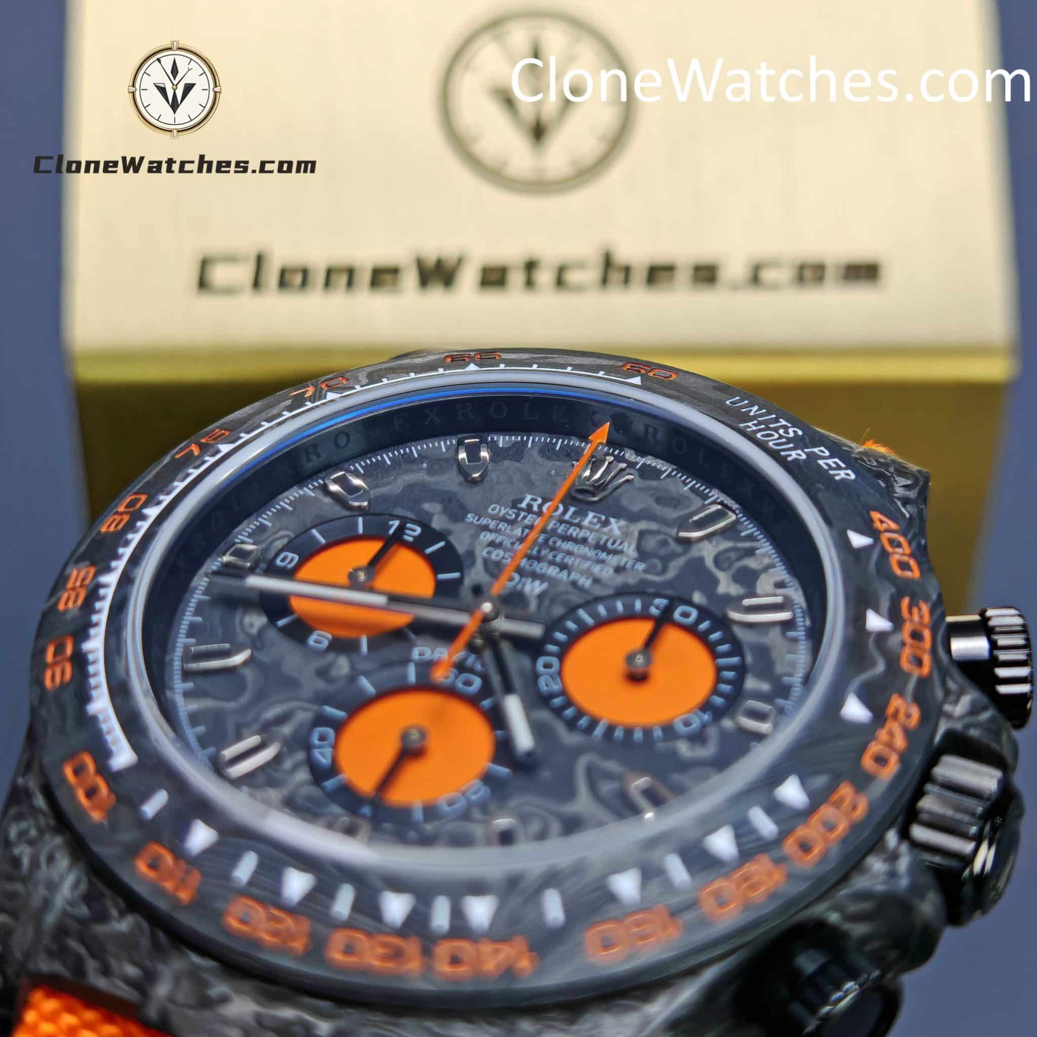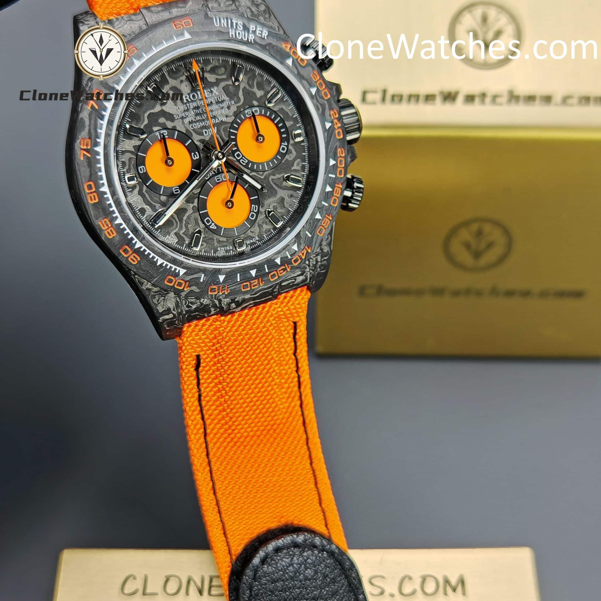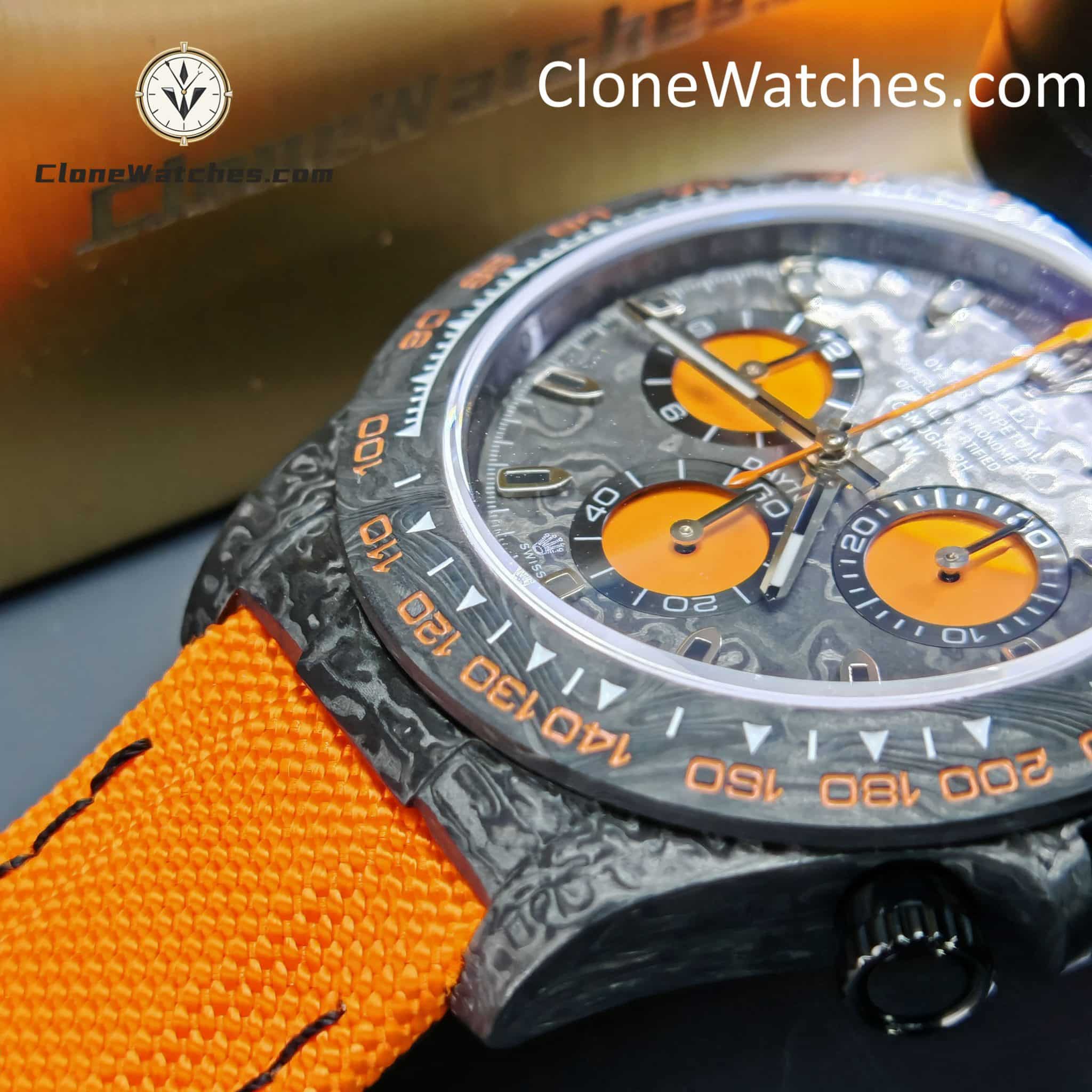 Rolex Daytona ORANGE EDITION Super Clone Watches are not only light to wear, but also very tough in appearance. And each watch has a unique carbon fiber pattern.