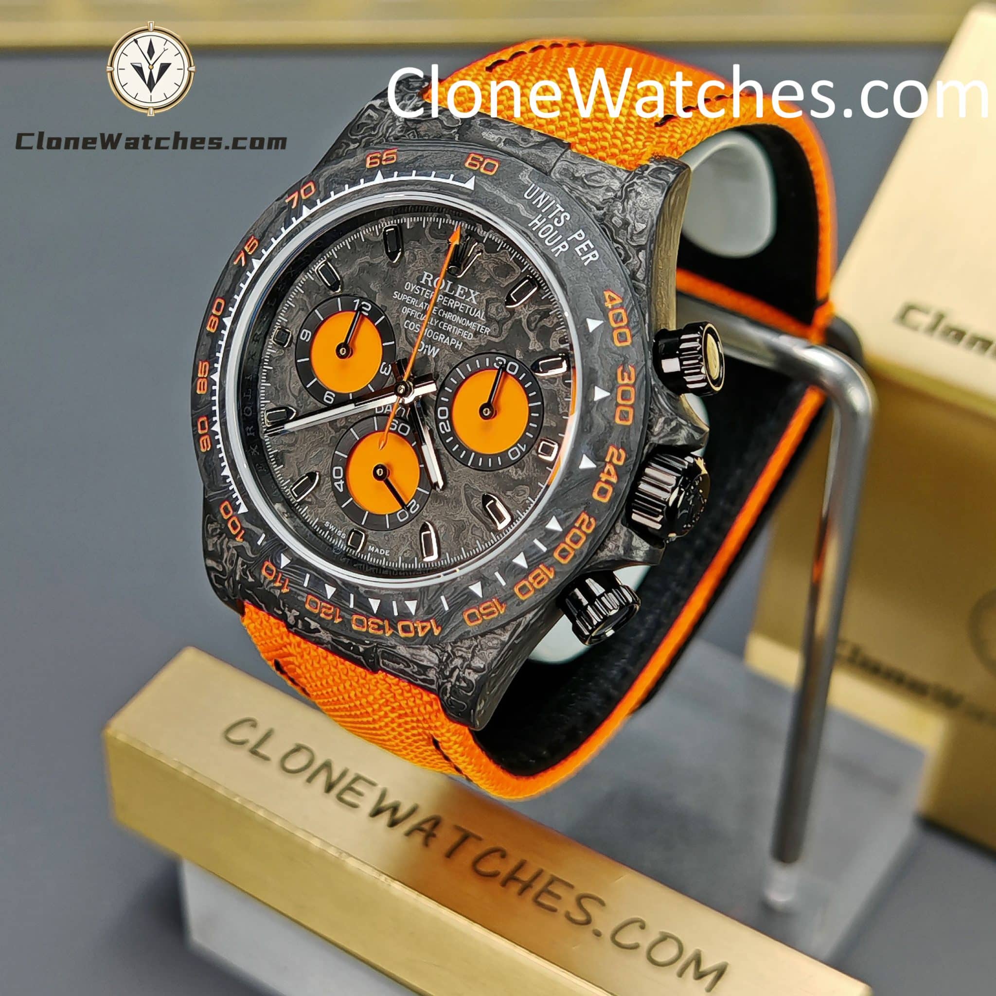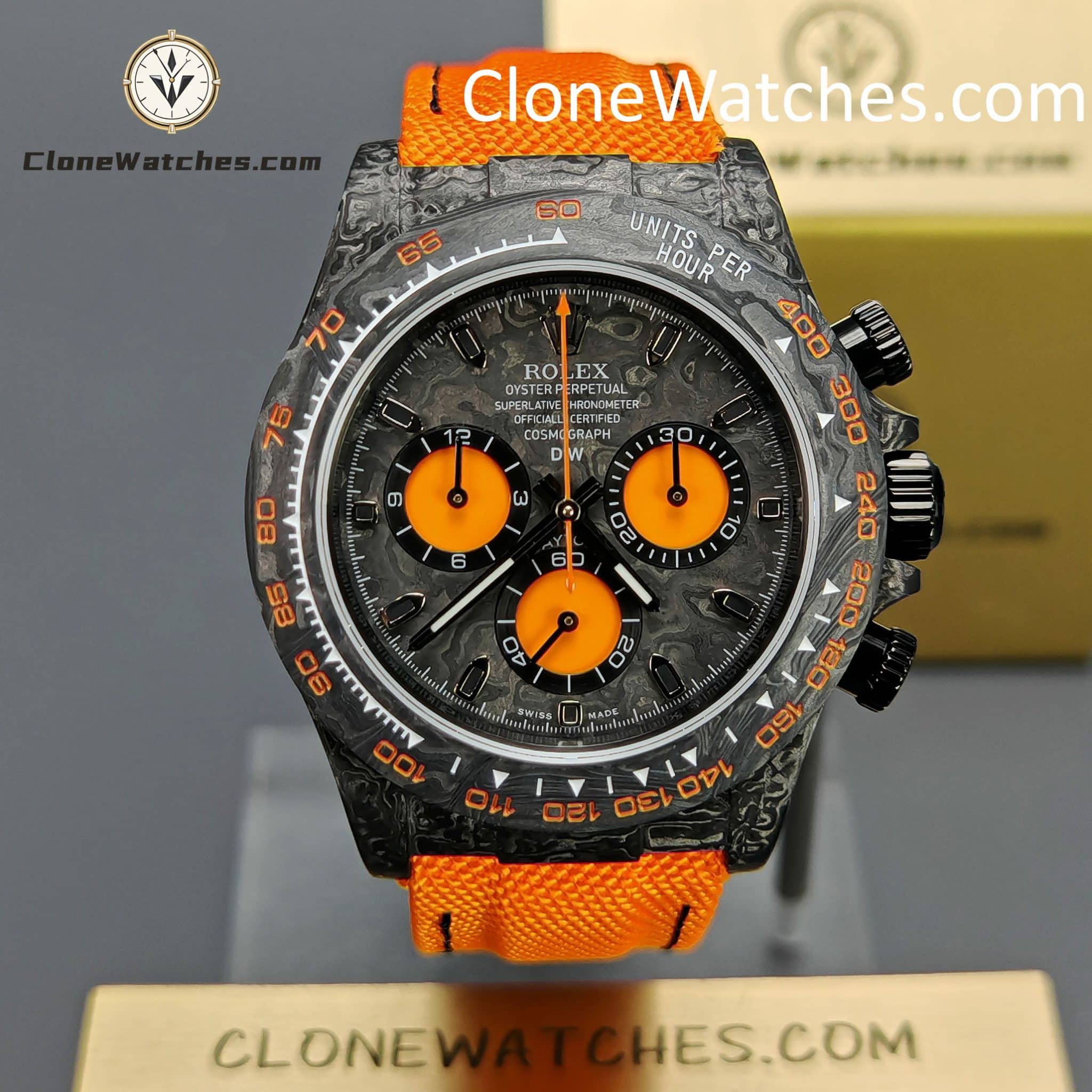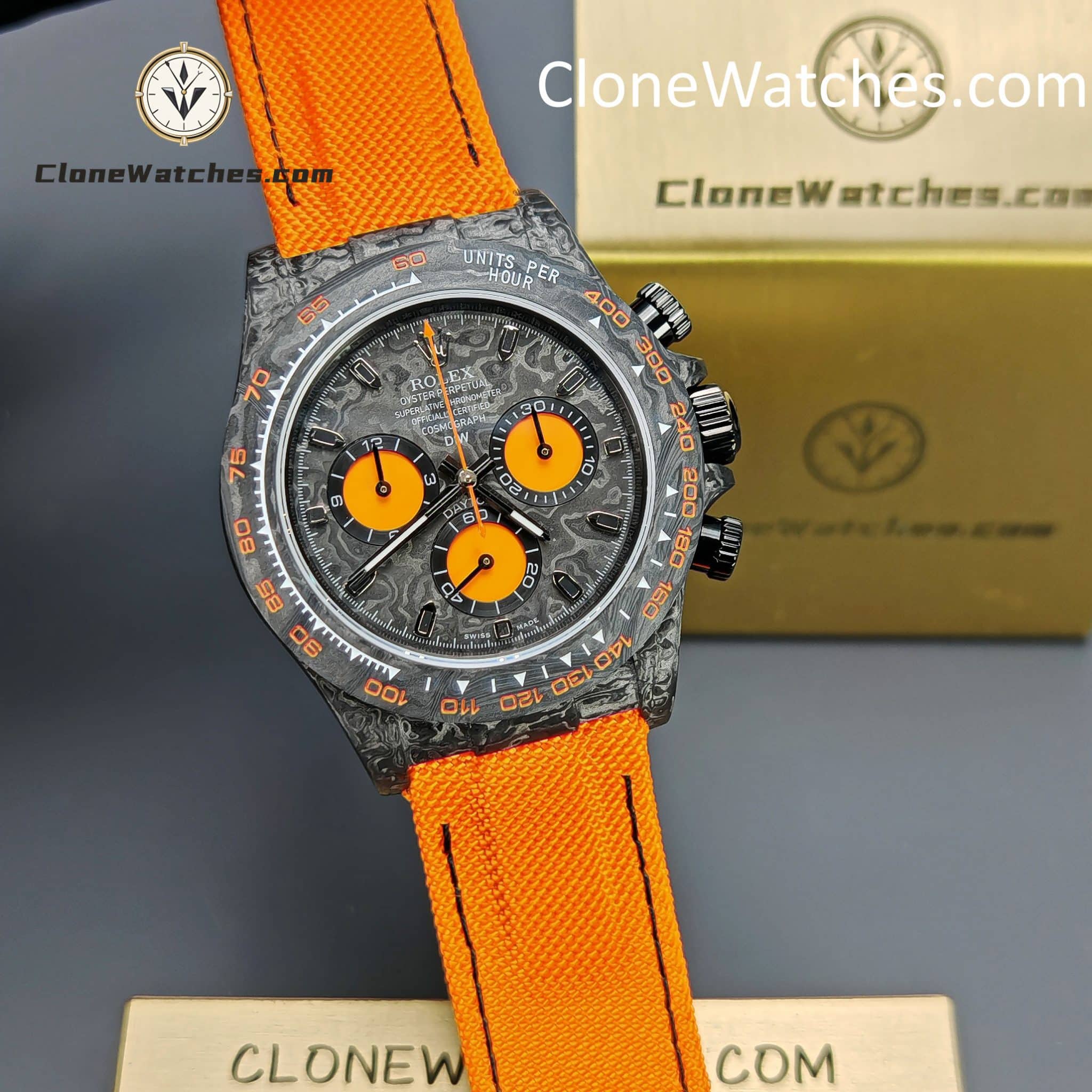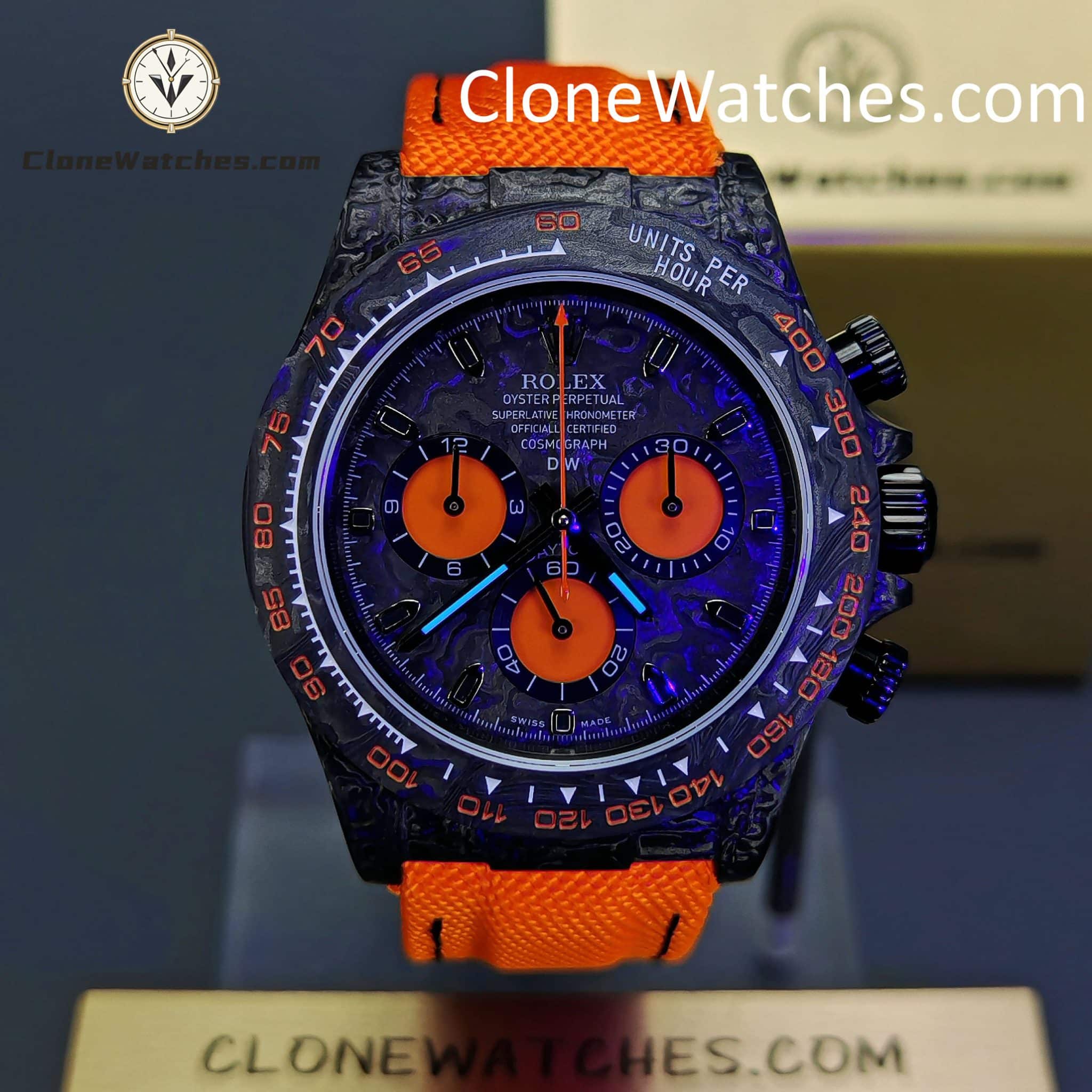 Rolex Daytona ORANGE EDITION Super Clone Watches are not only light to wear, but also very tough in appearance. And each watch has a unique carbon fiber pattern.