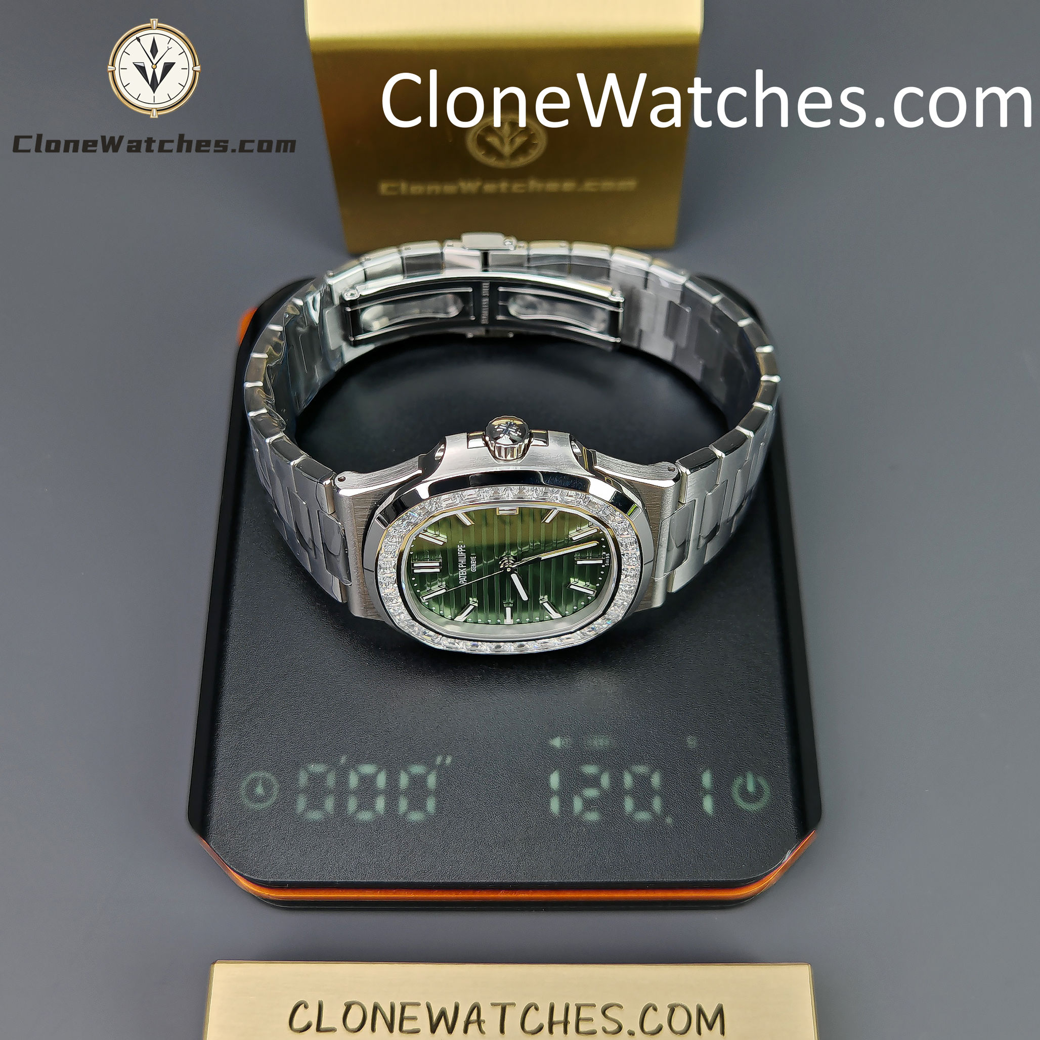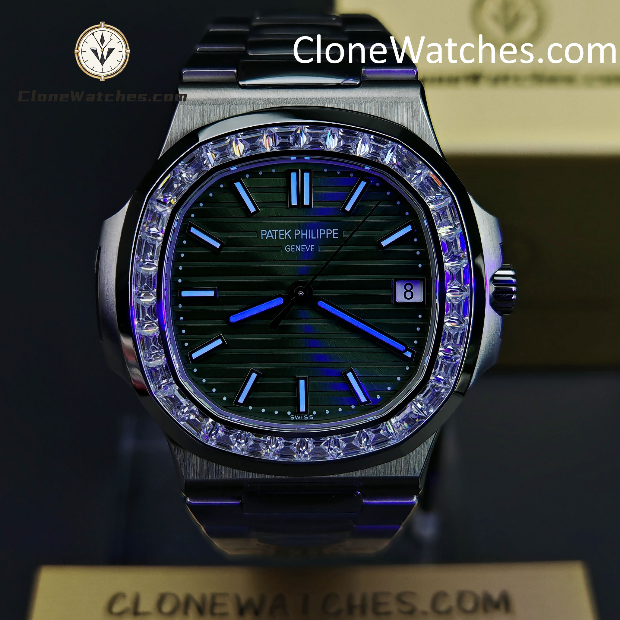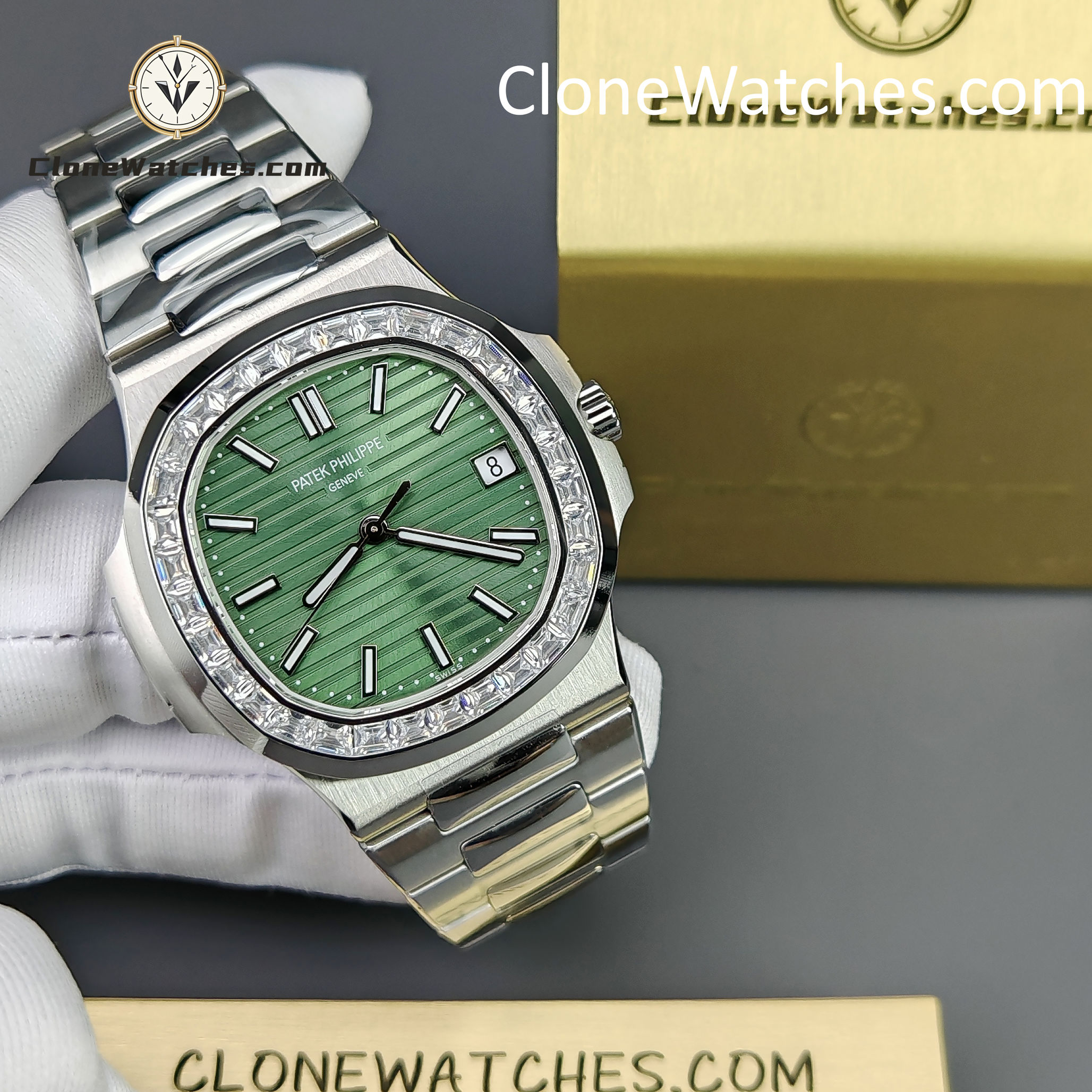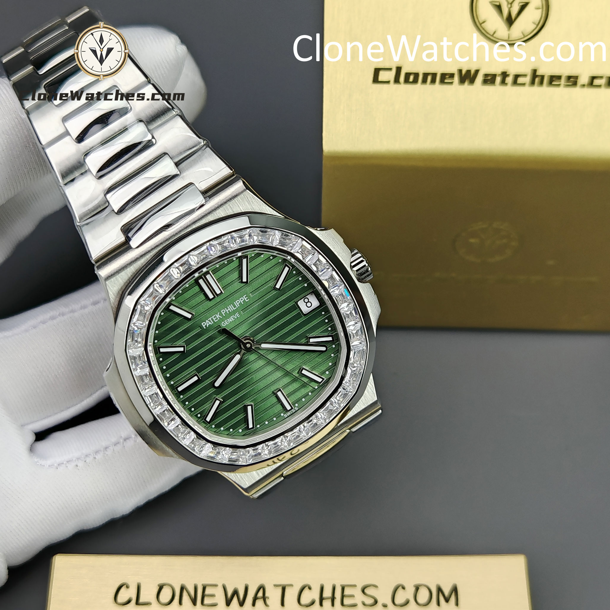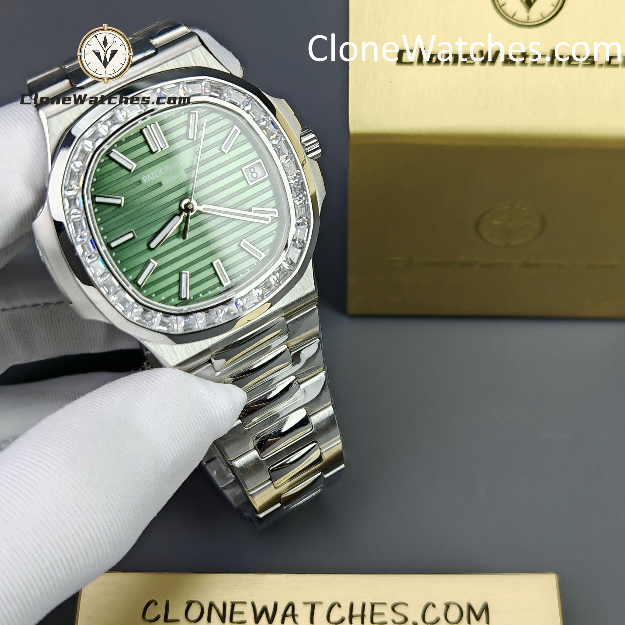Mimicking the Ref. 5711/1300A, the bezel is set with high-grade baguette-cut simulated diamonds (crystals) for brilliant light reflection.