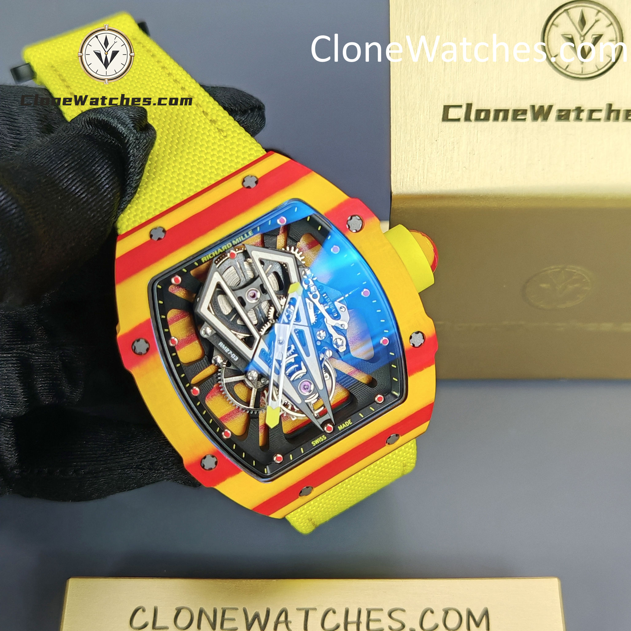 Richard Mille Super Clone Watches 1:1 RM 027 – 03 Tourbillon Rafael Nadal Yellow Strap
