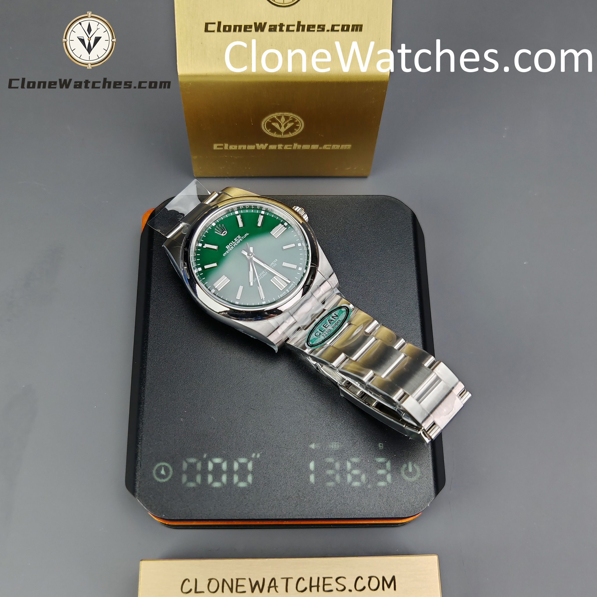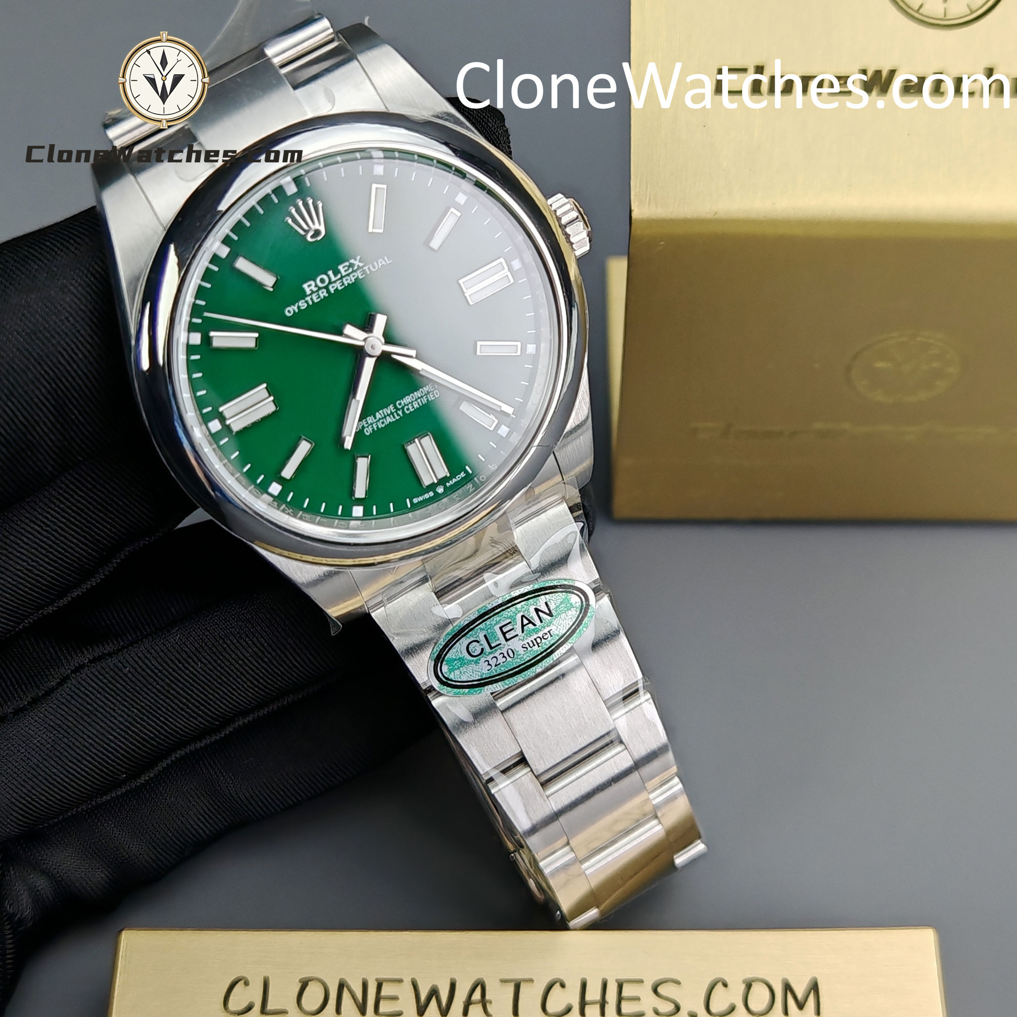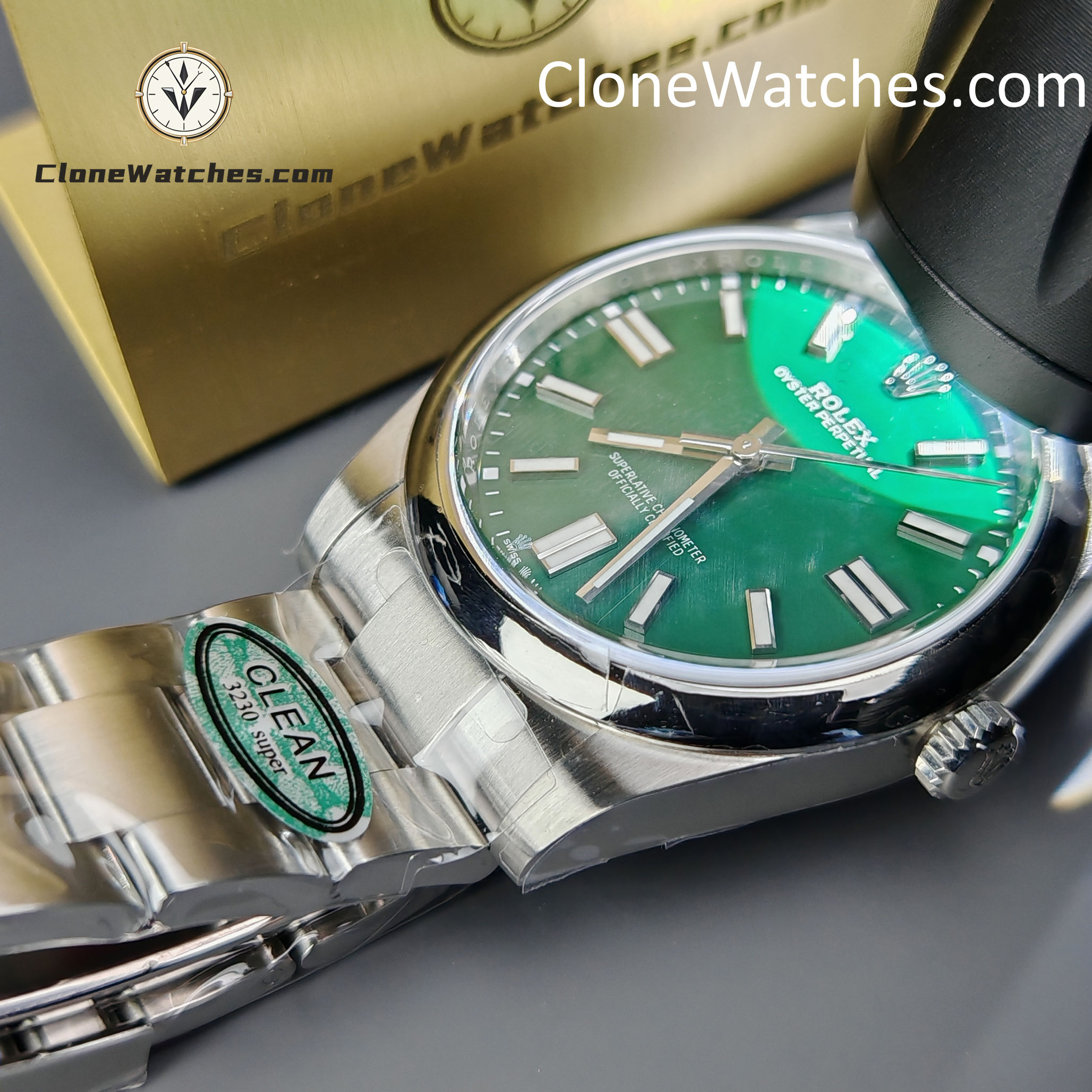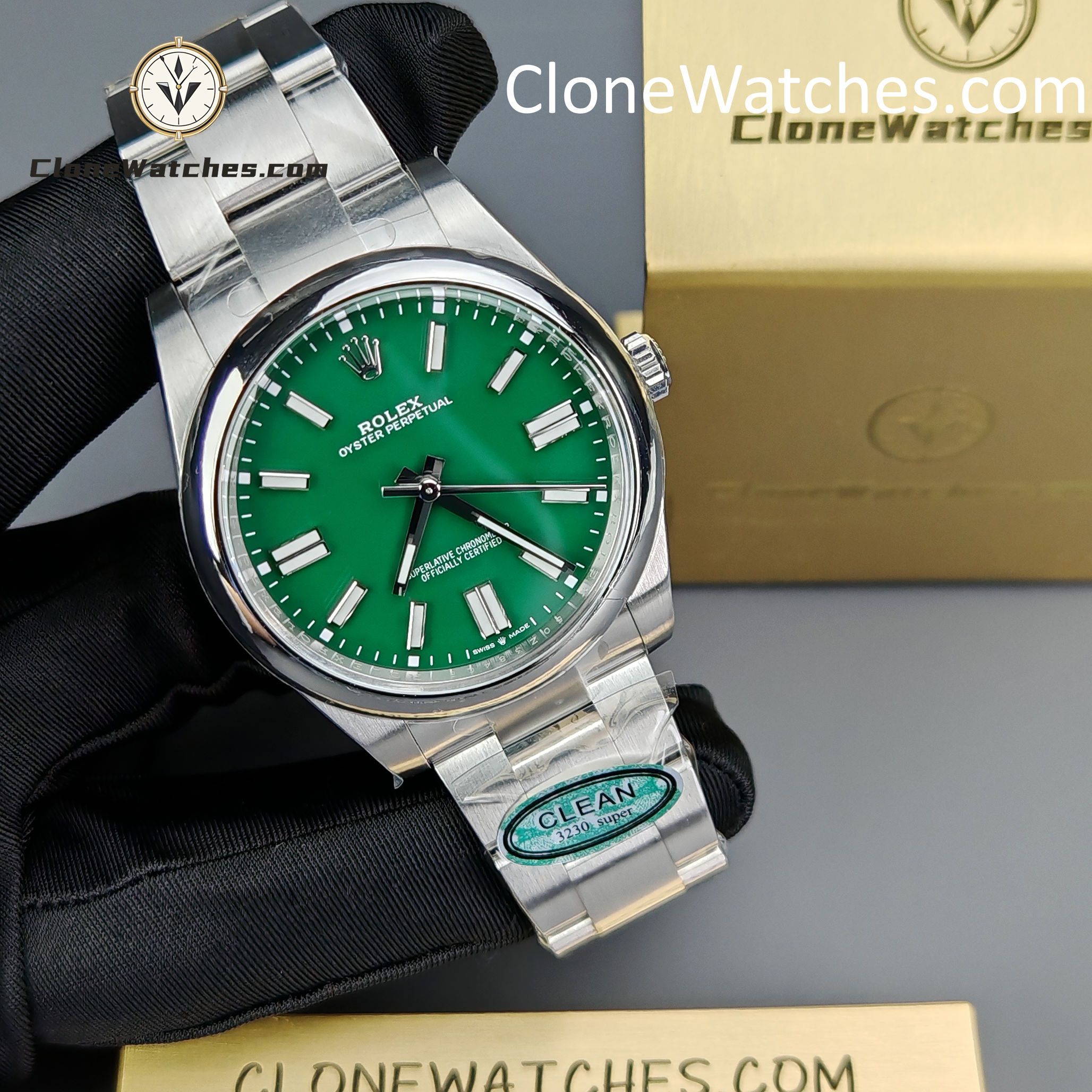Rolex Oyster Perpetual Super Clone Watches 124300 Green dial with 41mm case, comes with a satin Oyster strap for men. The magnificent clone Rolex Oyster Perpetual is made of 904L stainless steel and shines like the original. The Rolex Oyster Perpetual Super Clone is equipped with a 3230 1:1 clone movement.