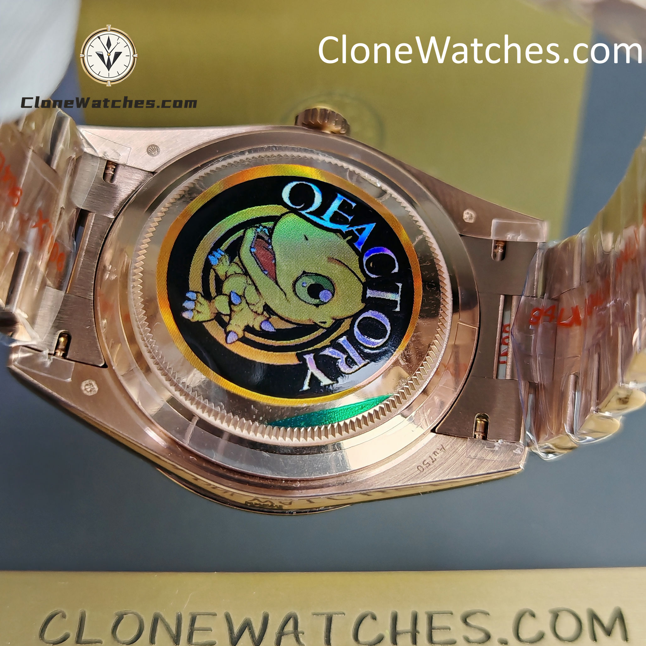 3: The market version of the precious metal logo at the 4 corners of the bottom of the case is usually laser laser, and the font is clear. Clone Watches uses a process of pressing first and then corroding to try to be consistent with the original!