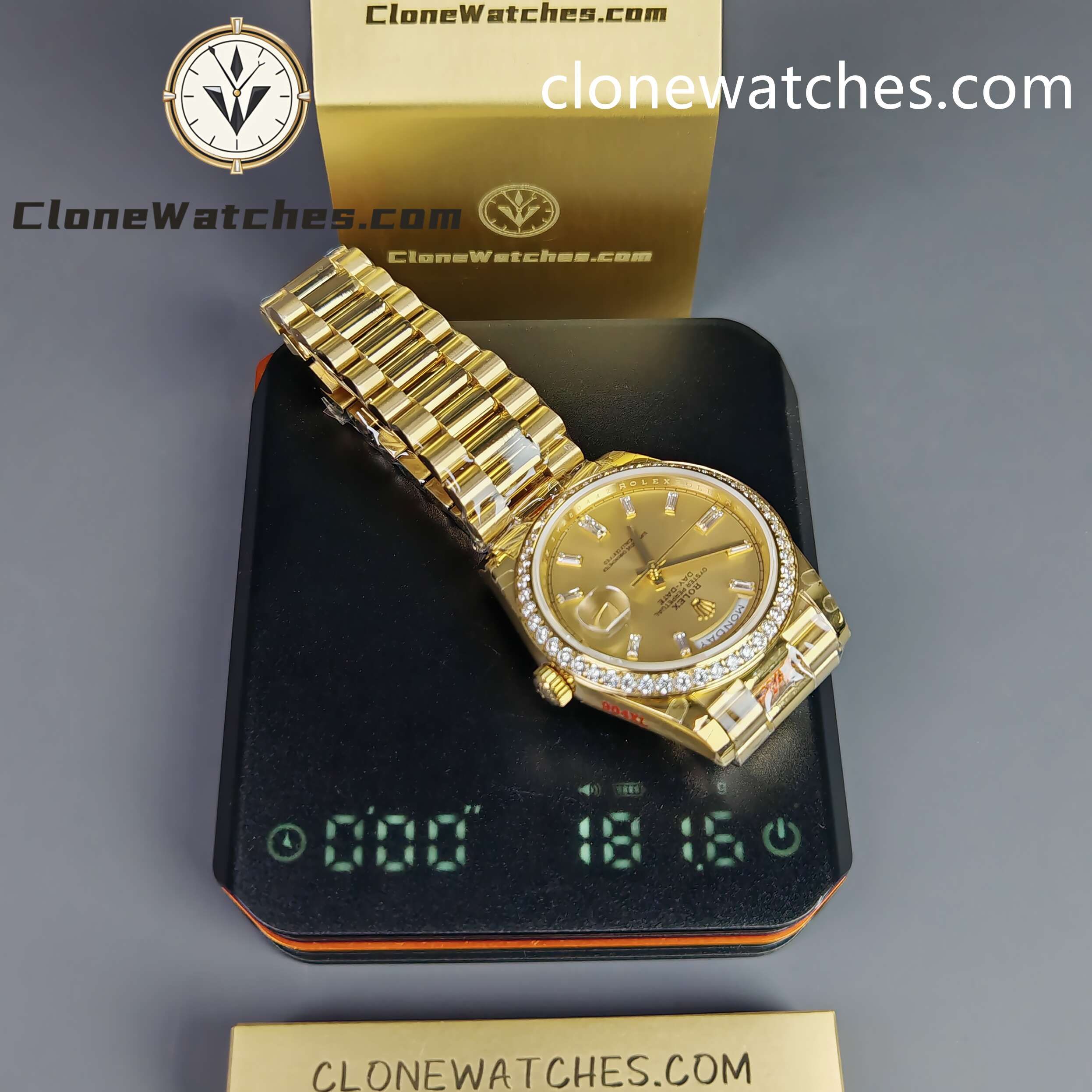A: This “Heavy” version weighs ~185g. A standard steel replica weighs ~140g. The Genuine solid gold is ~210g. This is currently the heaviest replica available, offering a very realistic wrist-feel.