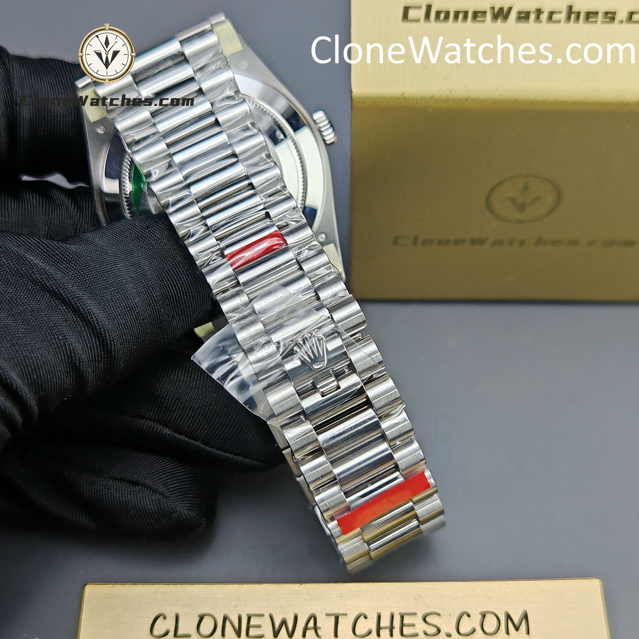 | Front Crystal | Made Of Sapphire, making this Rolex Super Clone Watches Day-Date 40mm scratch proof. Laser etched Rolex crown present at 6’O clock on the crystal |