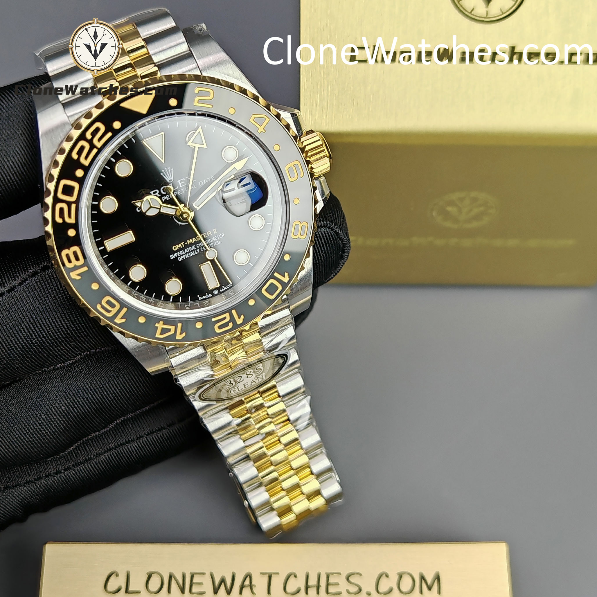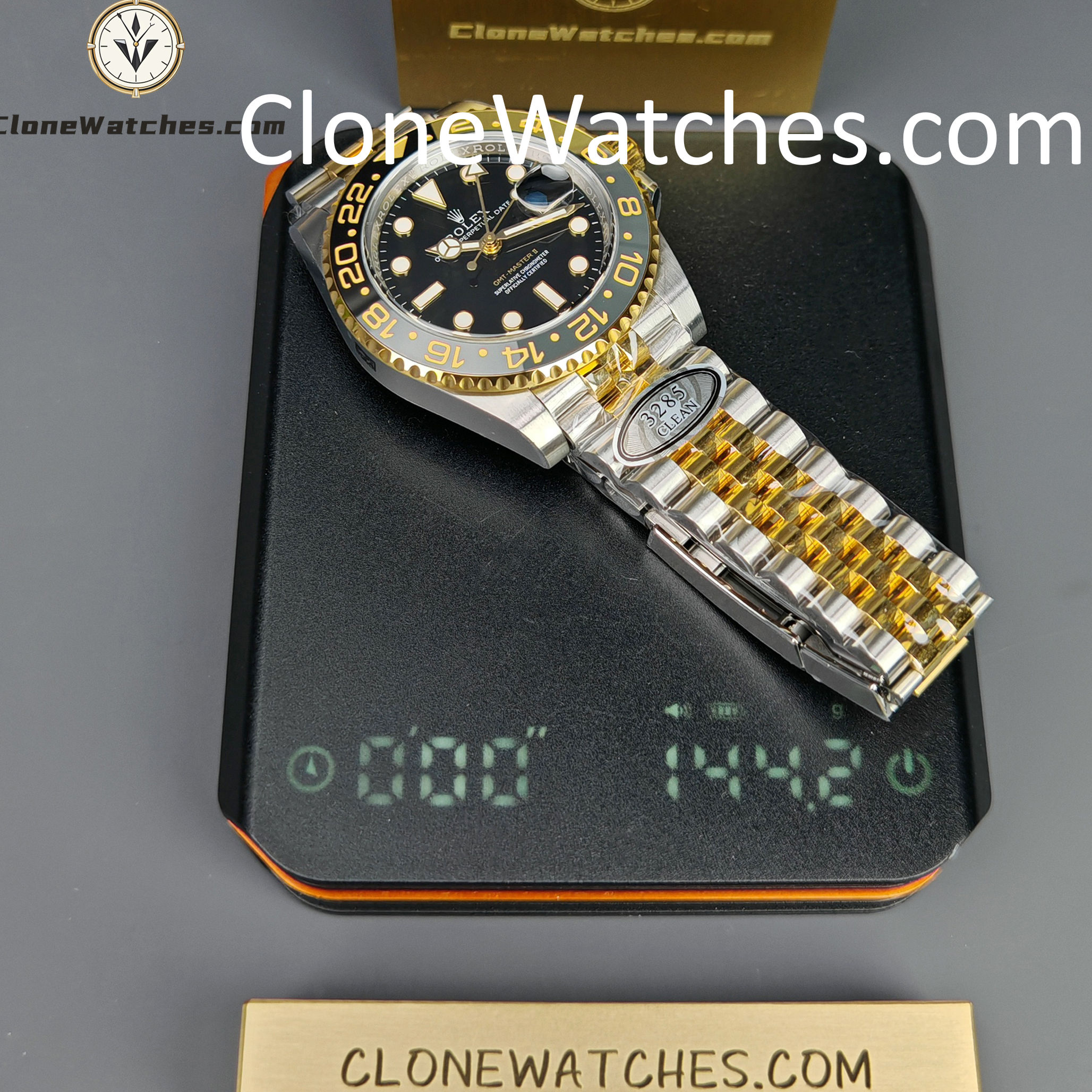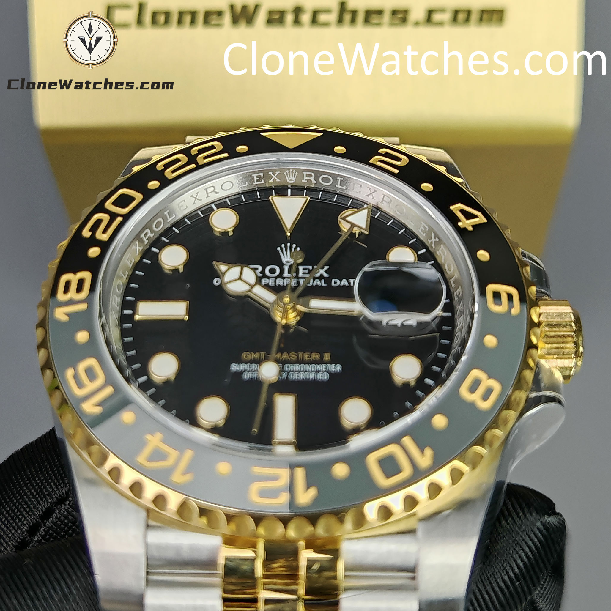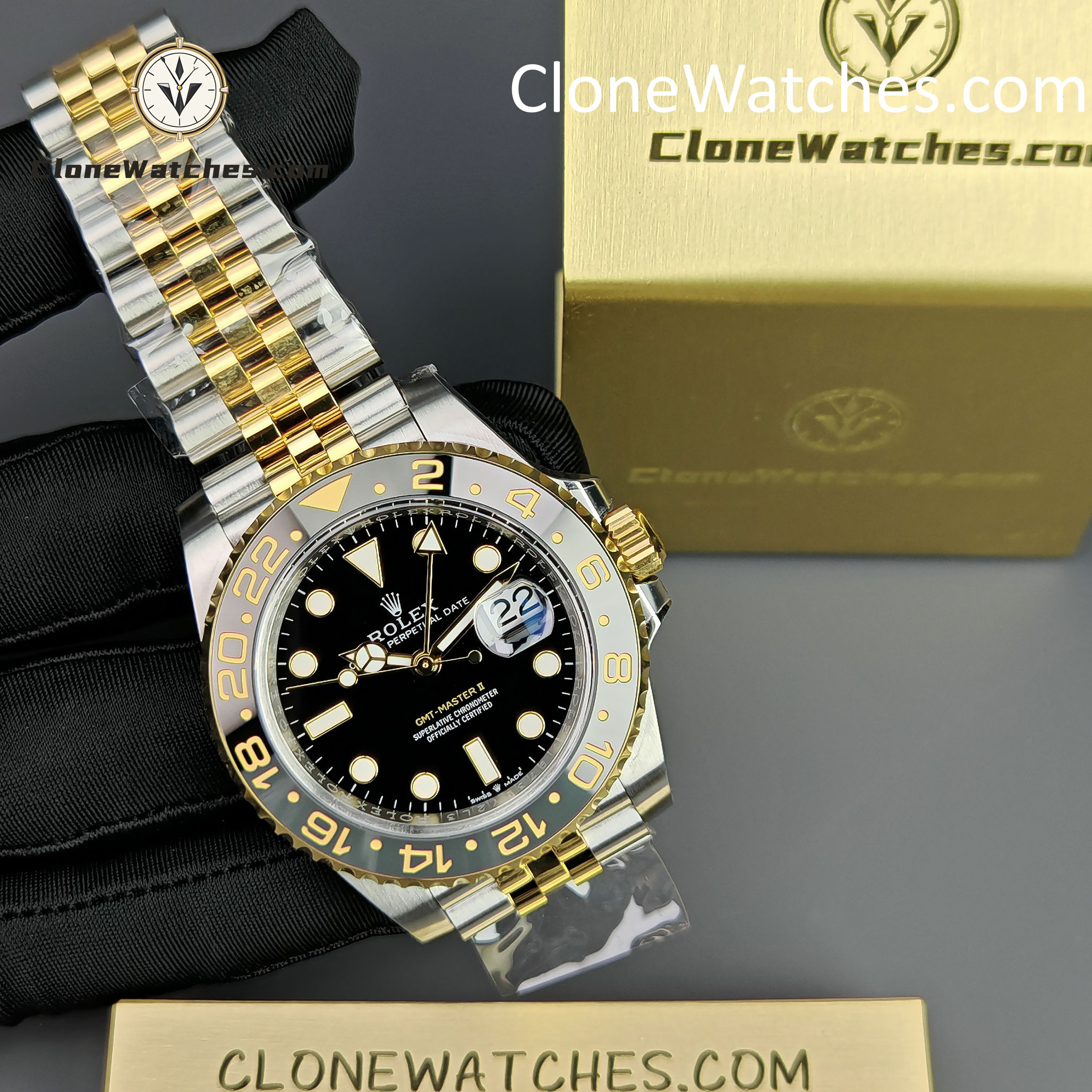 - Black & Grey Bezel: Correct “GRNR” colorway with 18k Yellow Gold plated numerals.