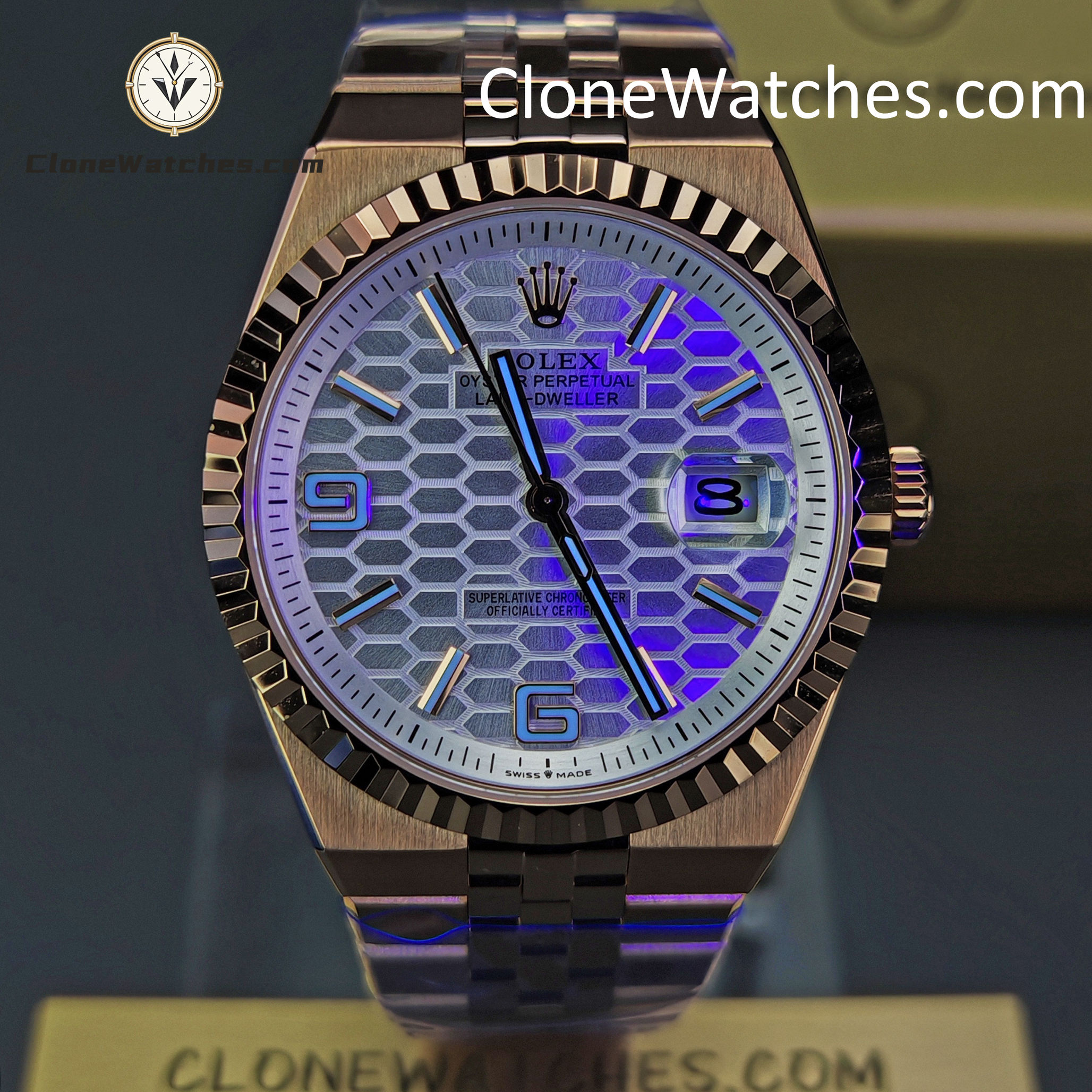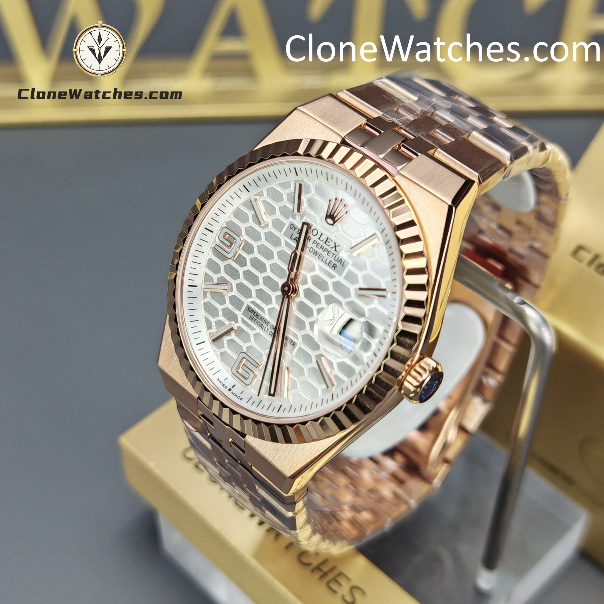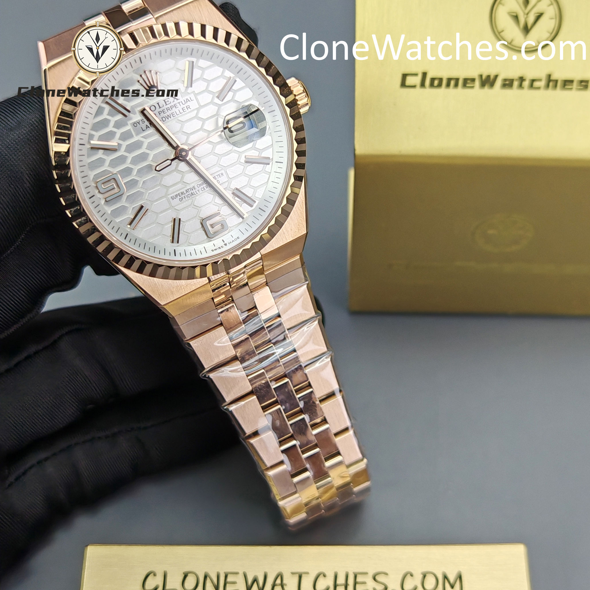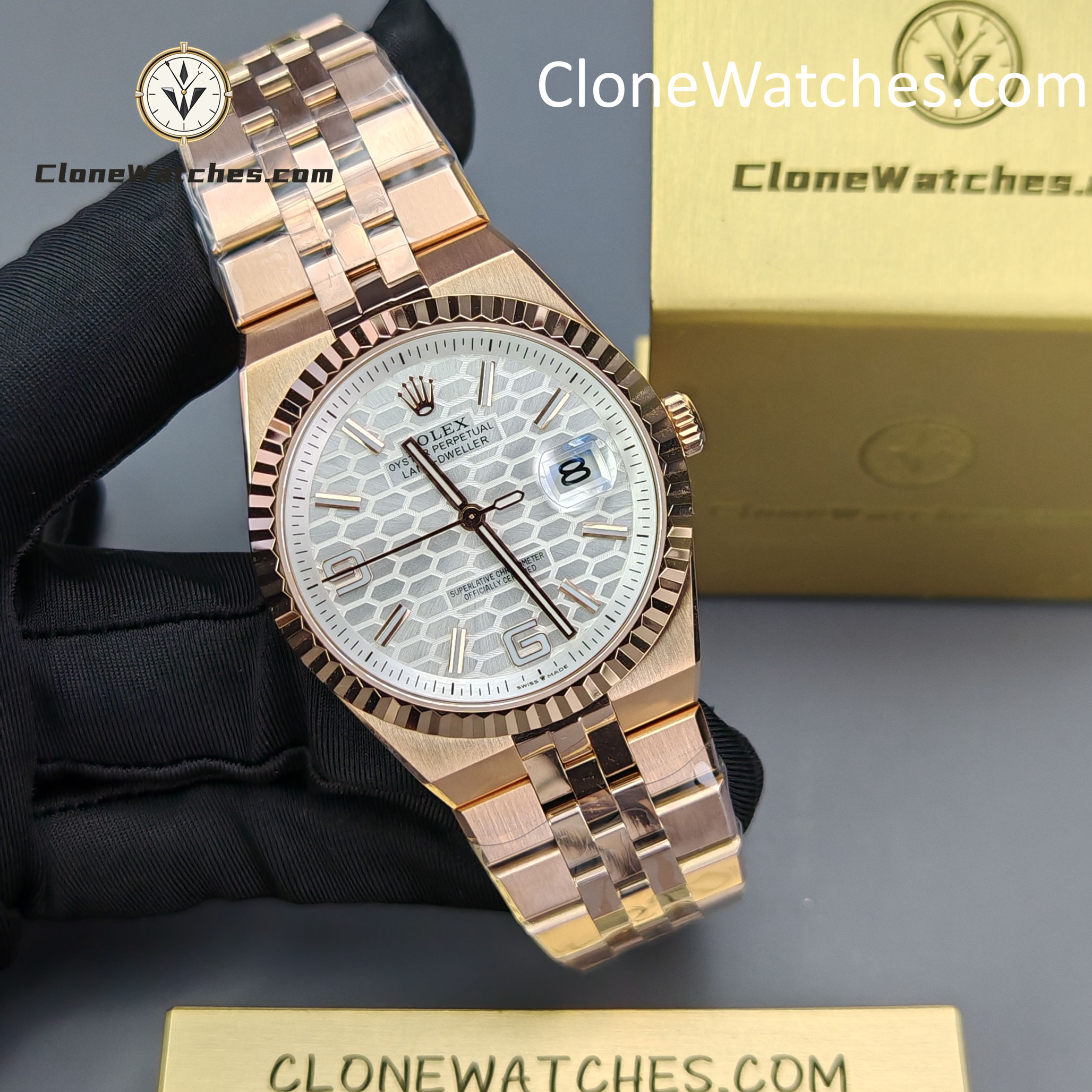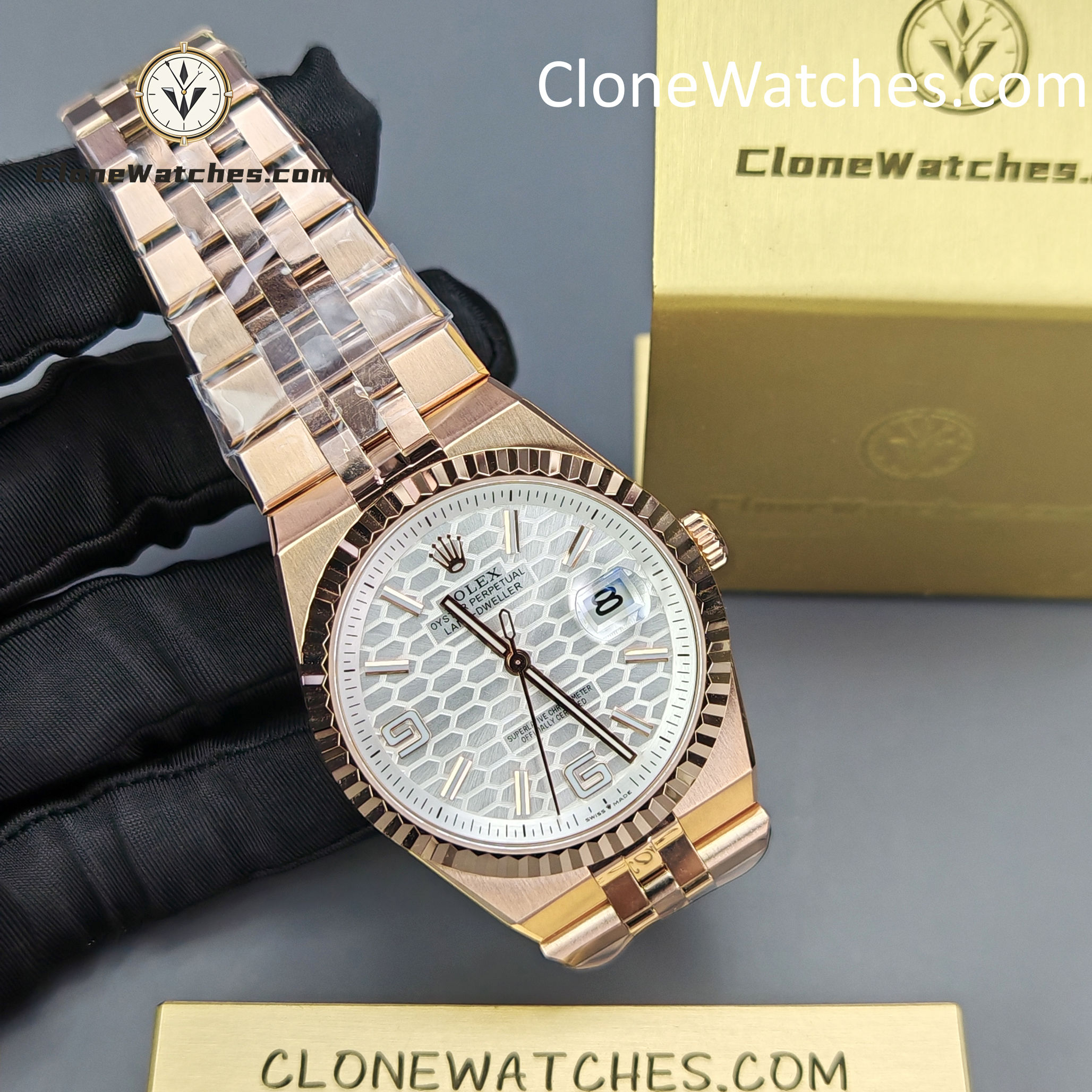 Introducing the Rolex Day-Date 127335-0001 Land-Dweller, a bold and rare factory test release in the high-end super clone watches category. This early prototype features a stunning white honeycomb 3D dial, full 18K rose gold-tone finishing, and an updated 40mm case size that mirrors the proportions of Rolex’s most modern references.