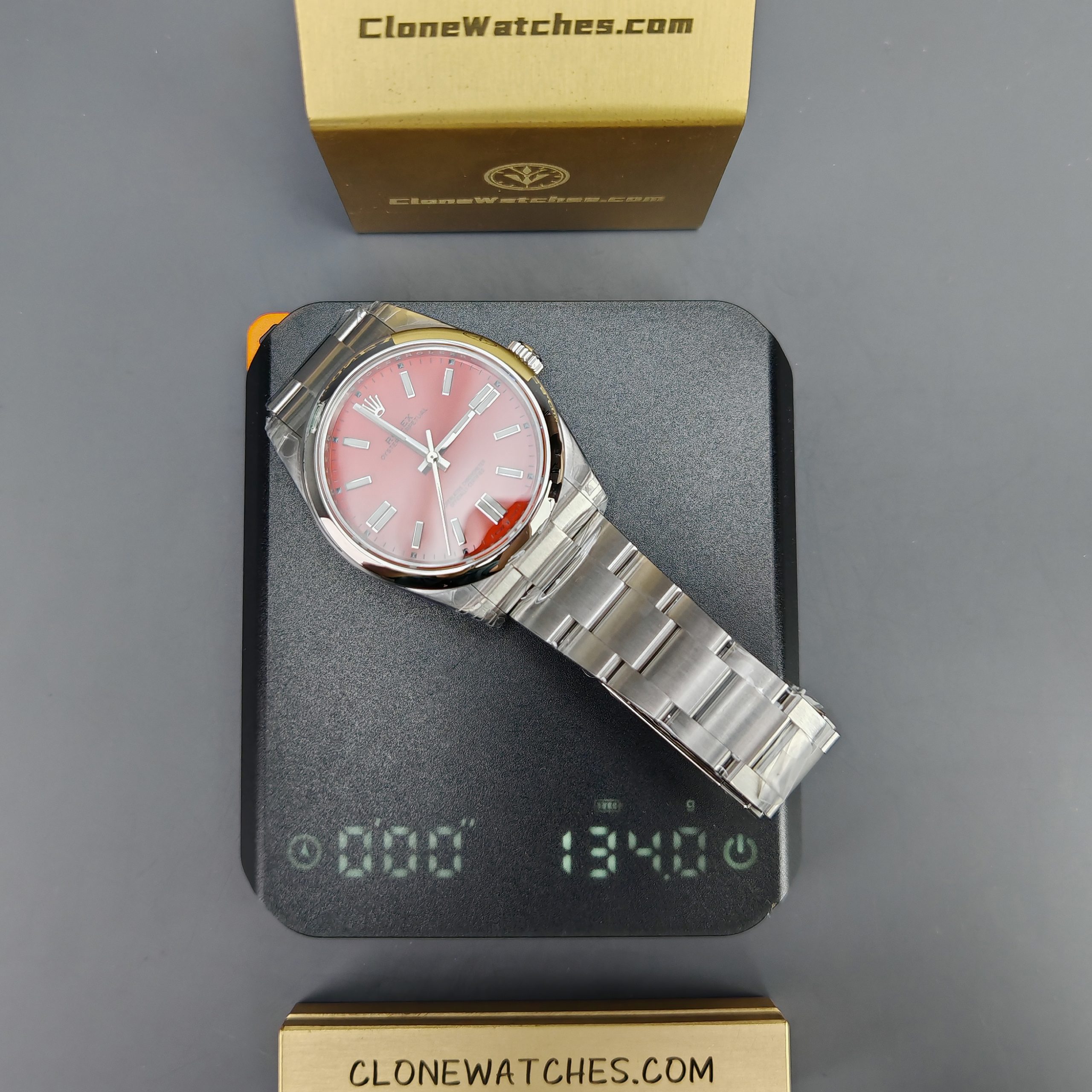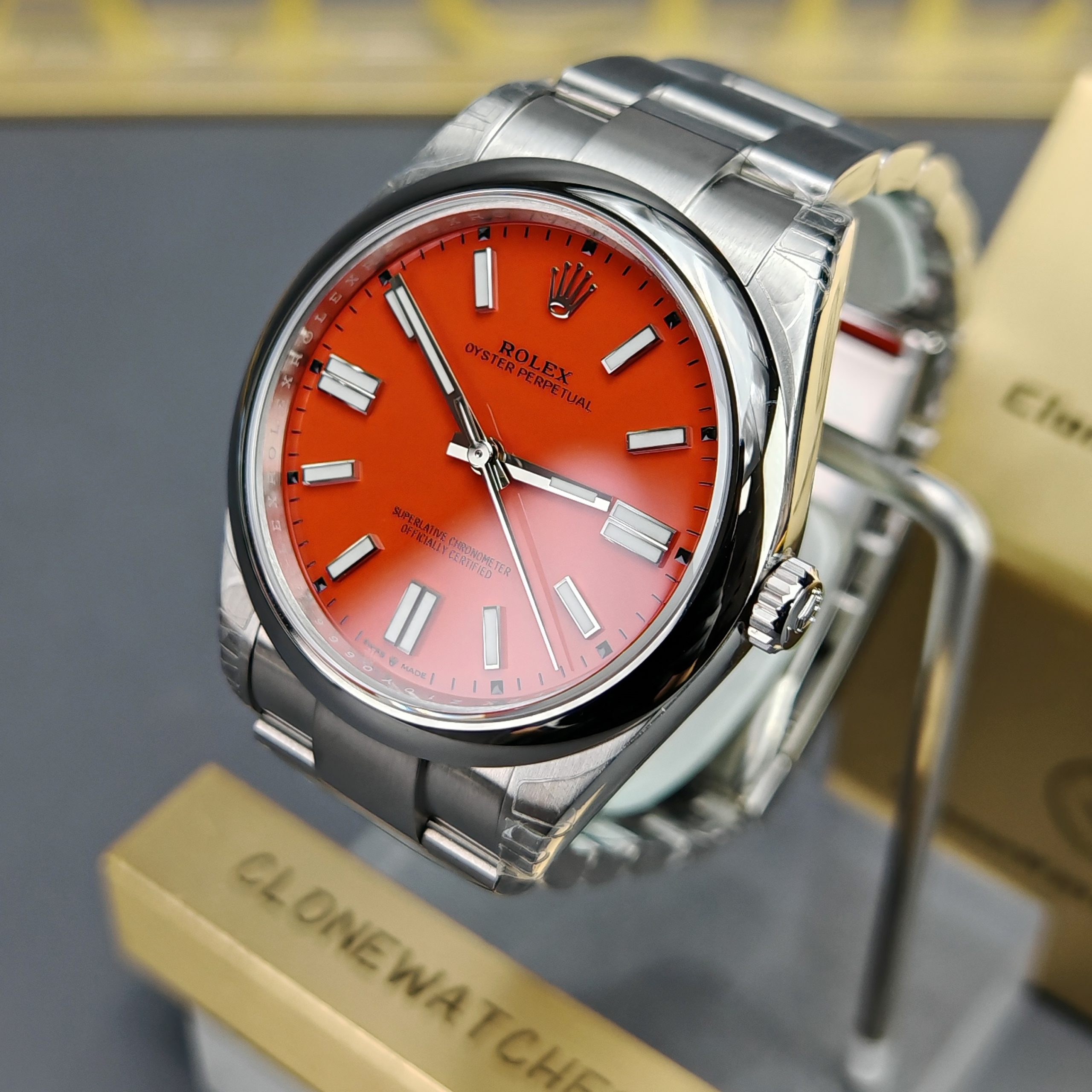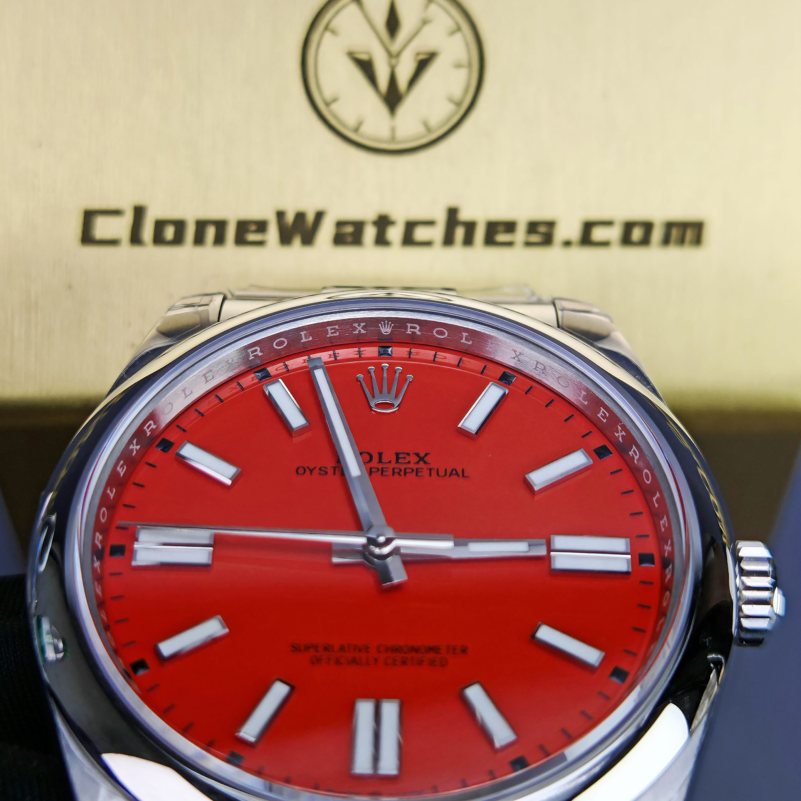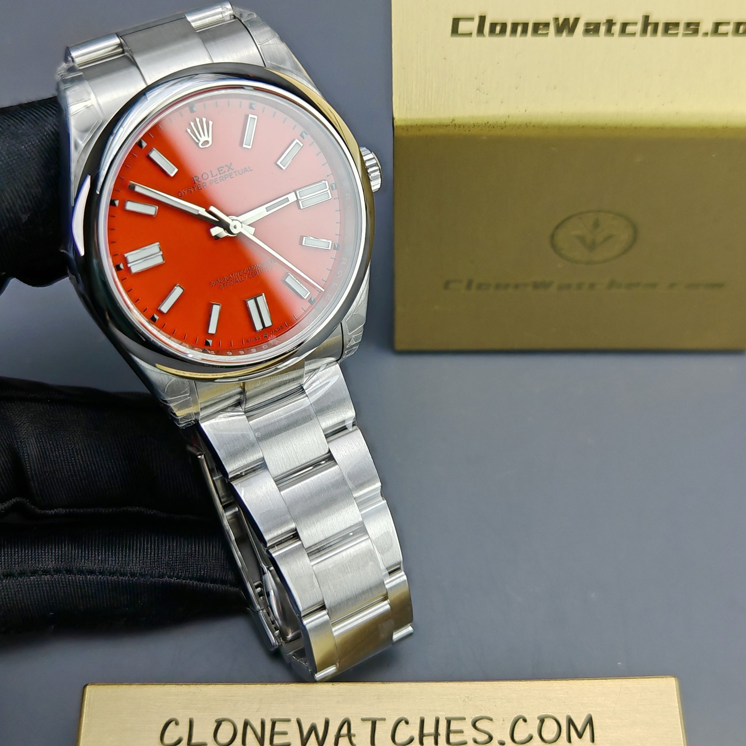 Rolex Oyster Perpetual Super Clone Watches 124300 Red dial with 41mm case, comes with a satin Oyster strap for men. The magnificent clone Rolex Oyster Perpetual is made of 904L stainless steel and shines like the original. The Rolex Oyster Perpetual Super Clone is equipped with a 3230 1:1 clone movement.