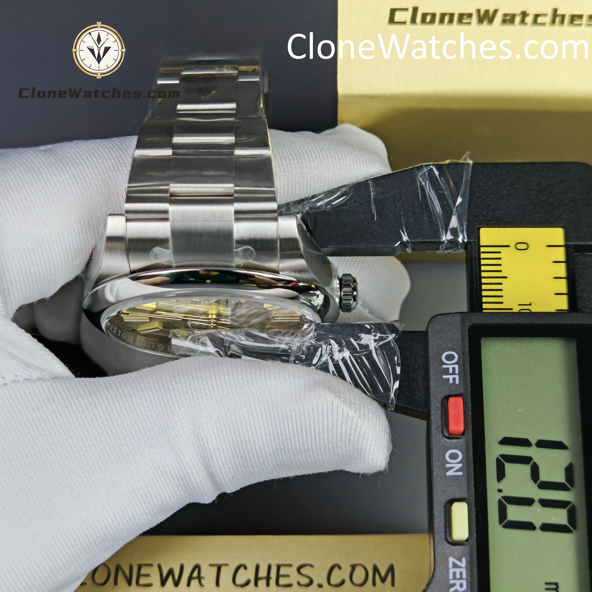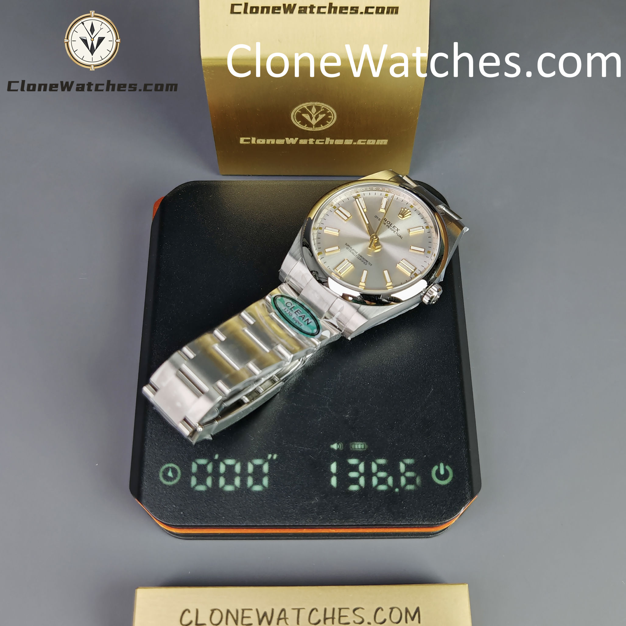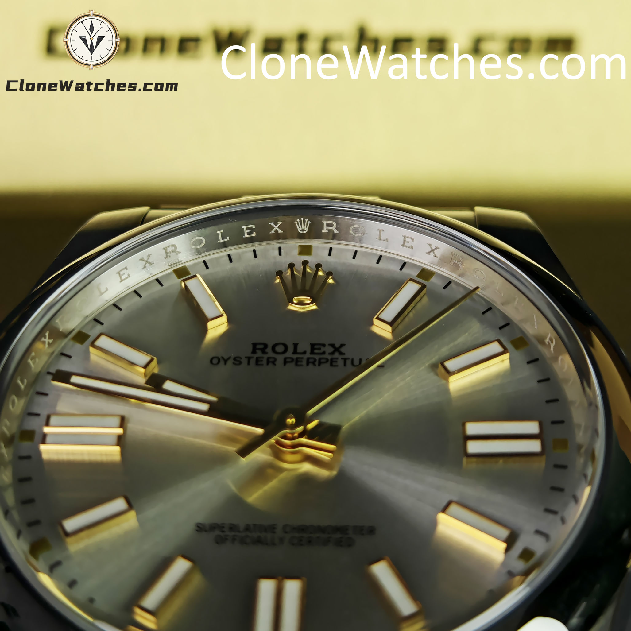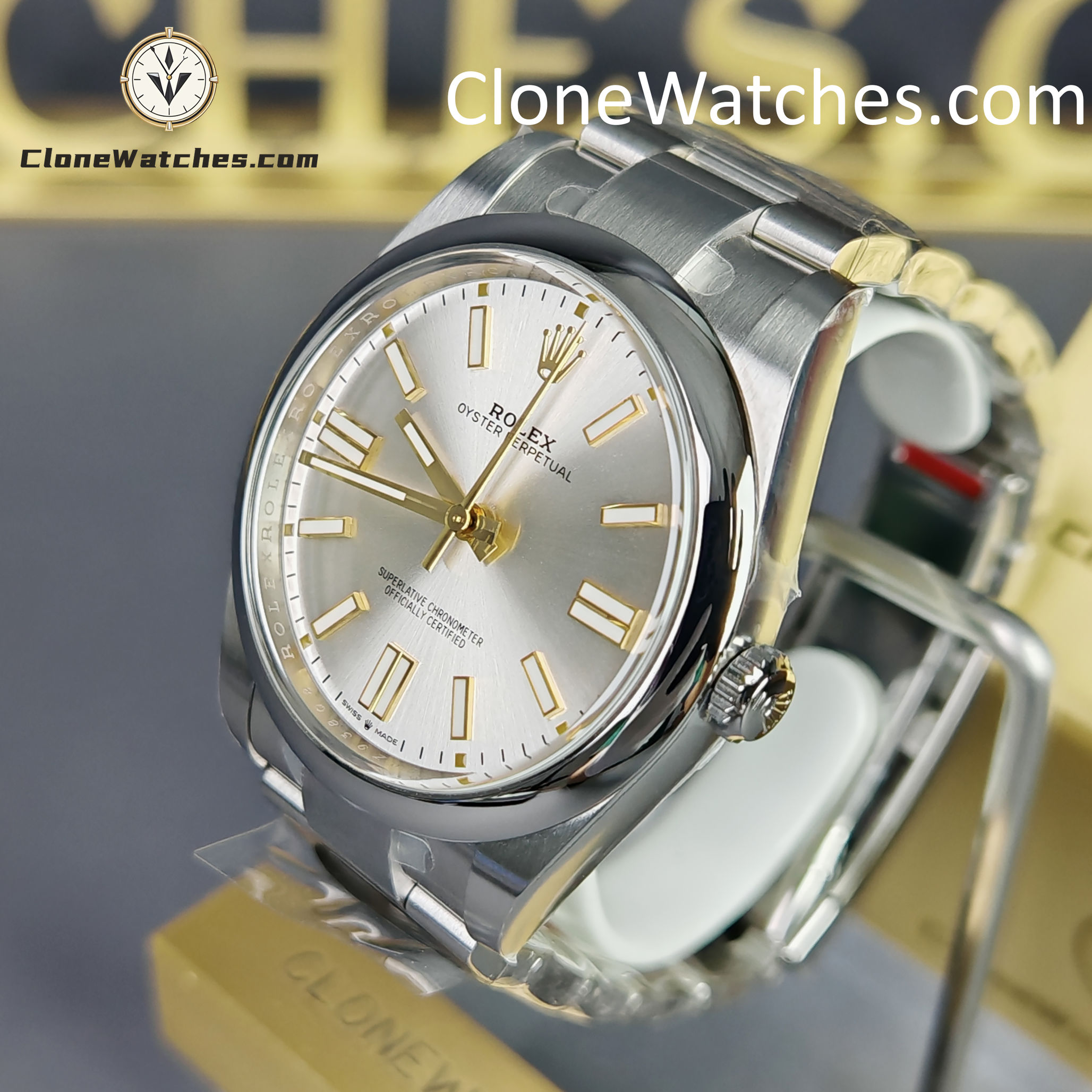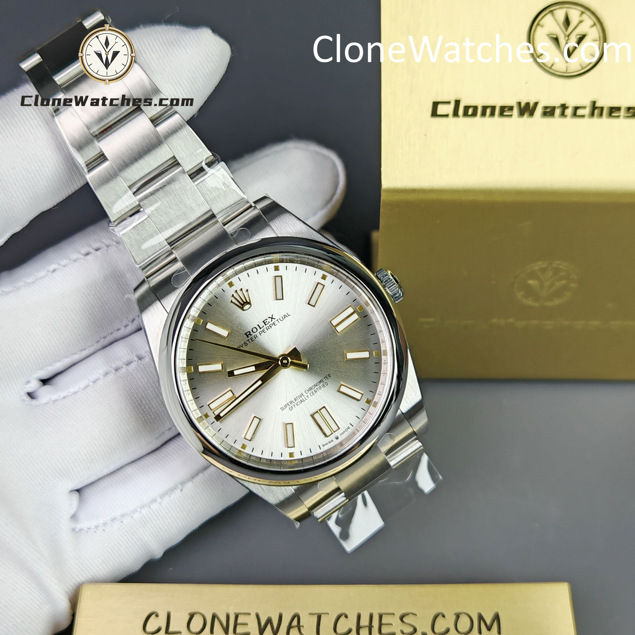 A: This is a specific design feature of the Genuine 124300 Silver Dial model. Rolex uses 18ct yellow gold hour markers to prevent tarnishing and add contrast. VSF has replicated this two-tone effect perfectly.