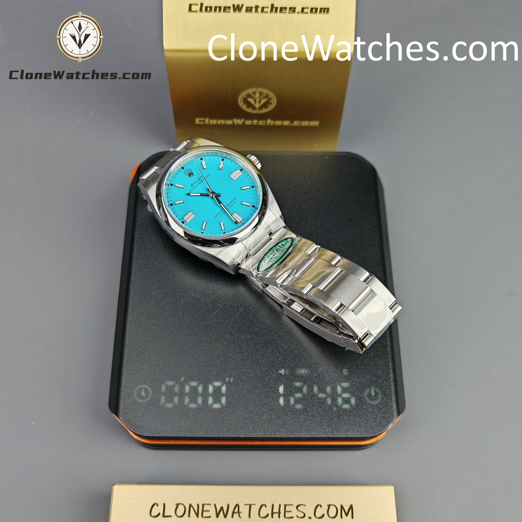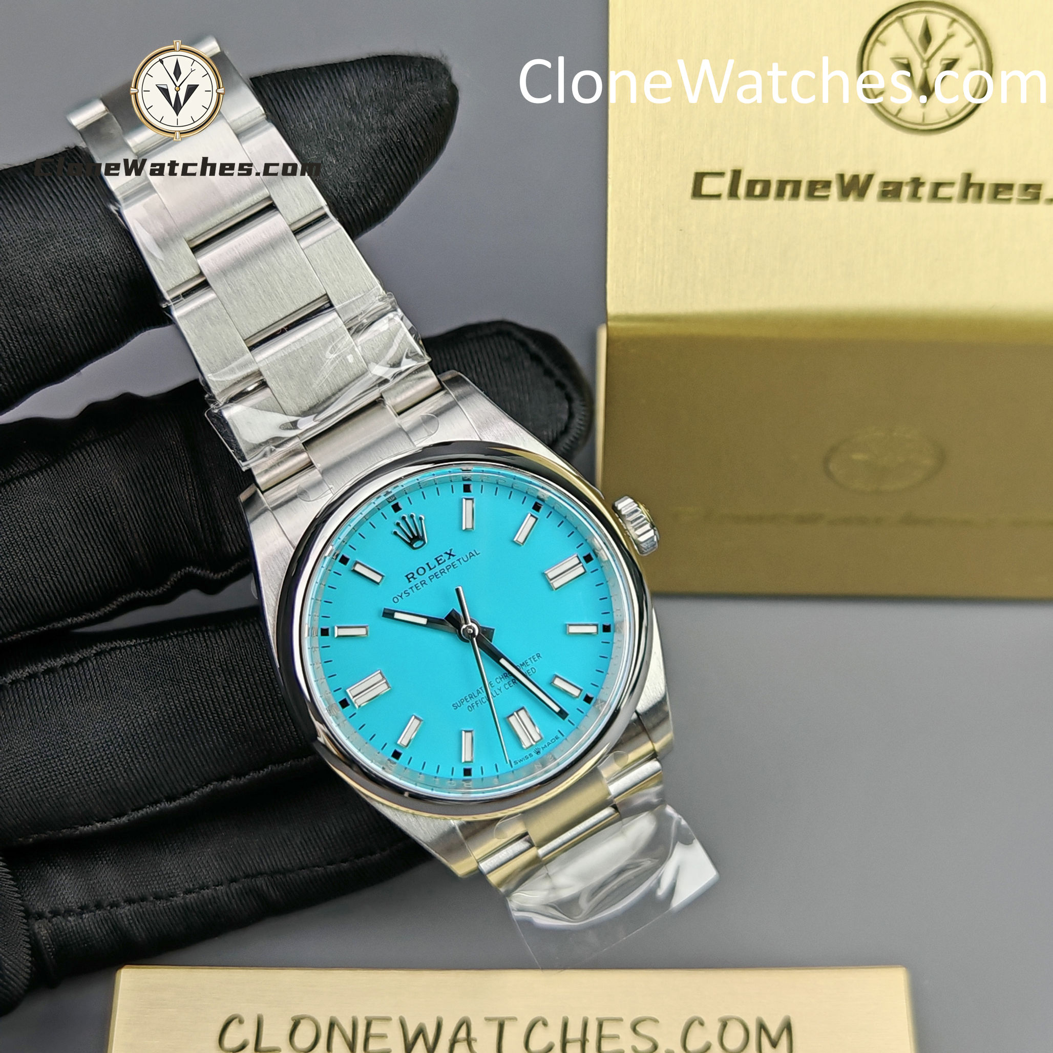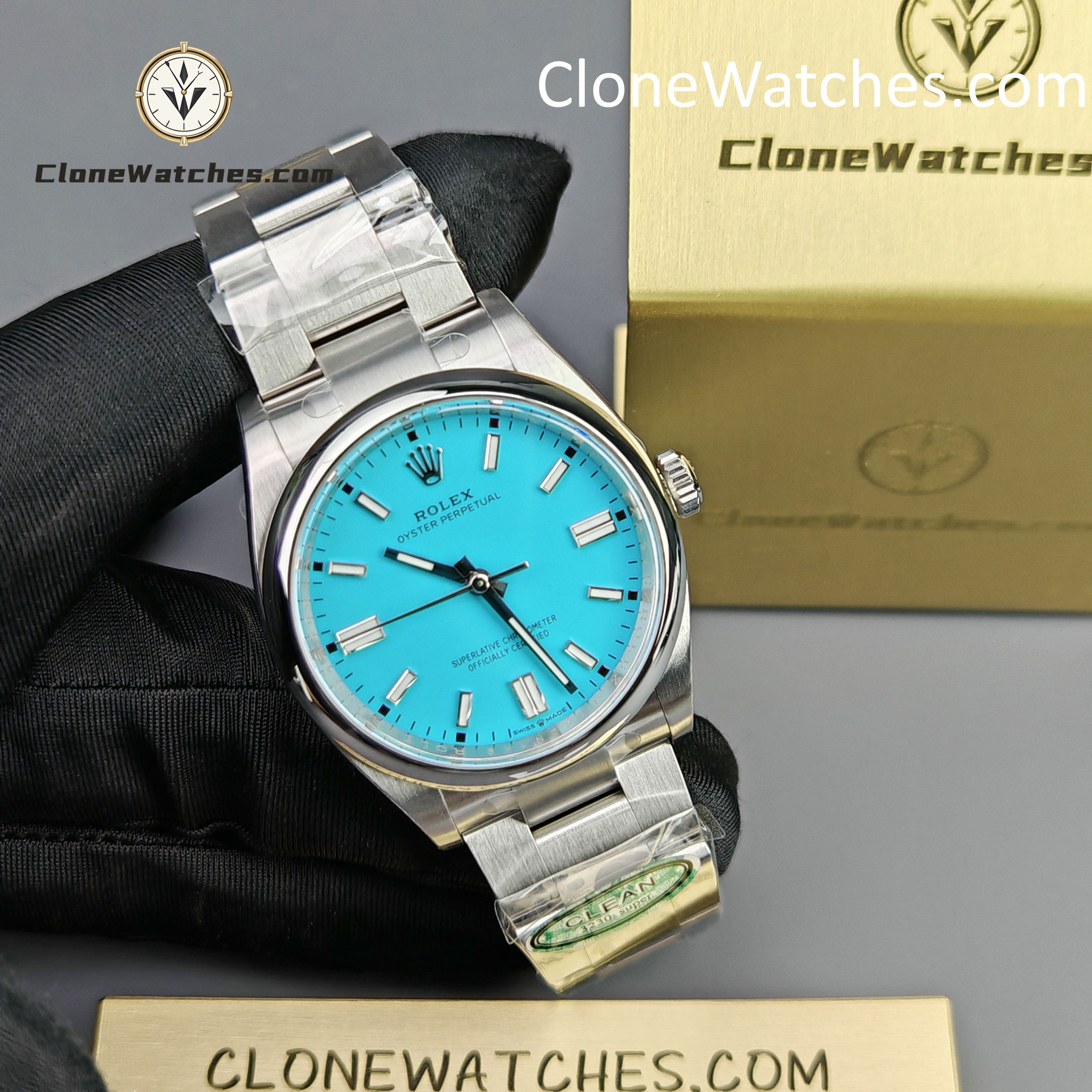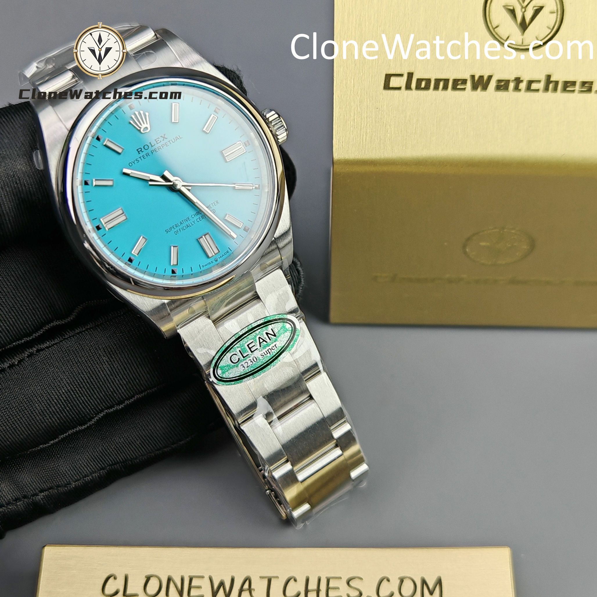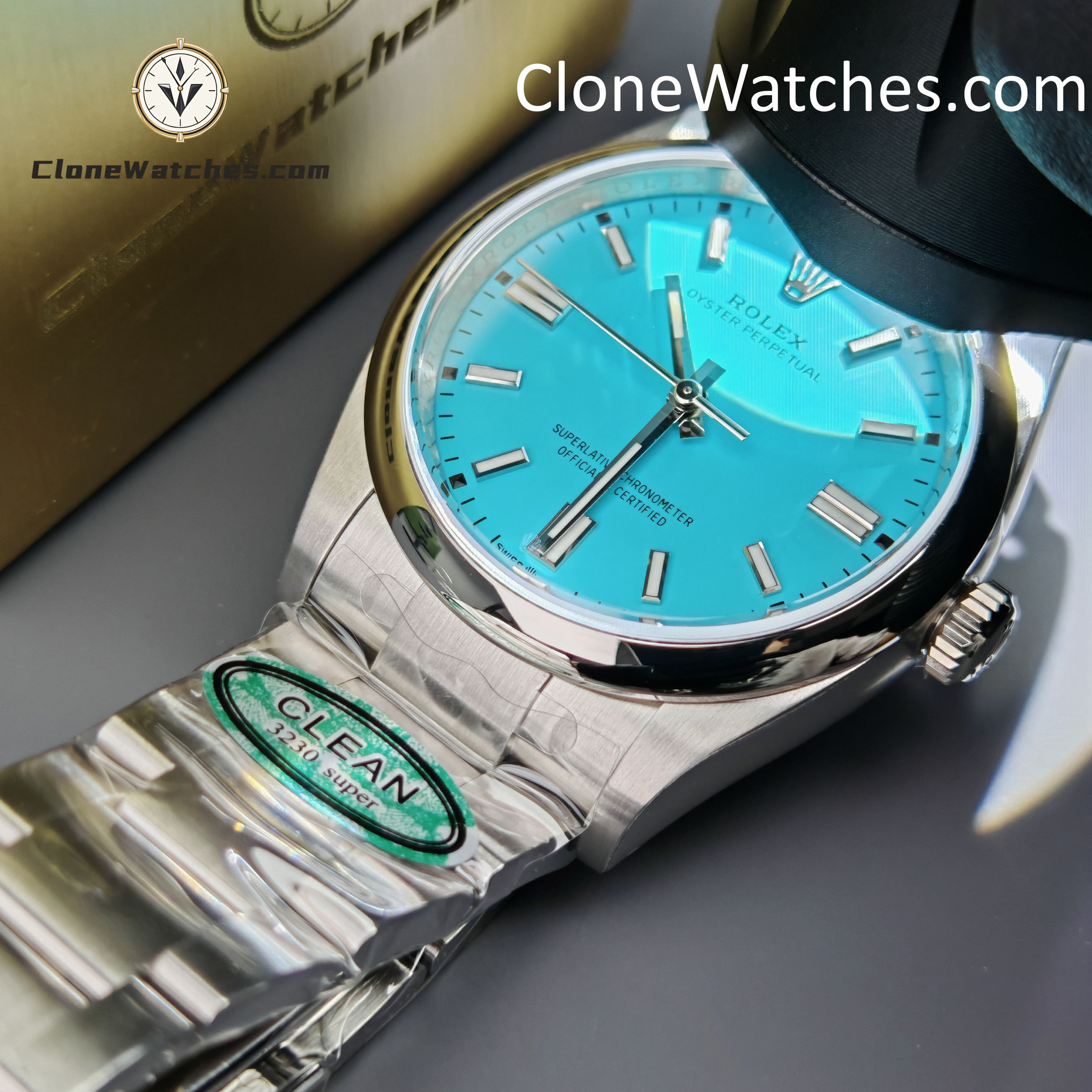 Rolex Oyster Perpetual Super Clone Watches 126000 Turquoise Blue dial with 36mm case, comes with a satin Oyster strap for . The magnificent clone Rolex Oyster Perpetual is made of 904L stainless steel and shines like the original. The Rolex Oyster Perpetual Super Clone is equipped with a 3230 1:1 clone movement.