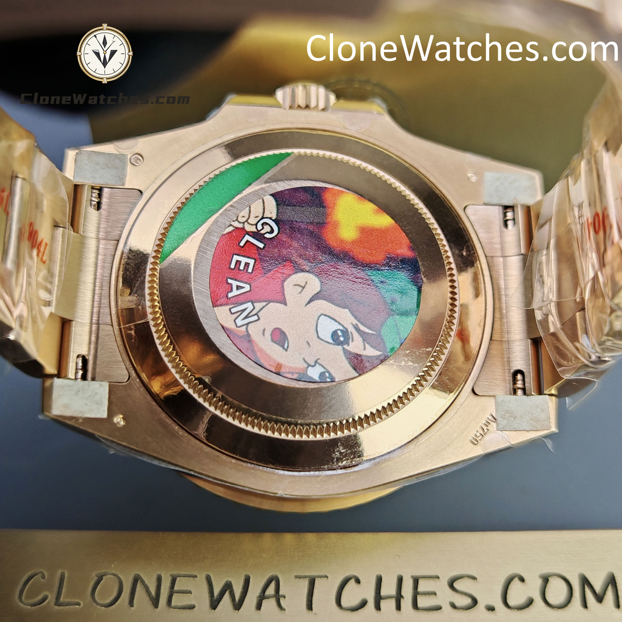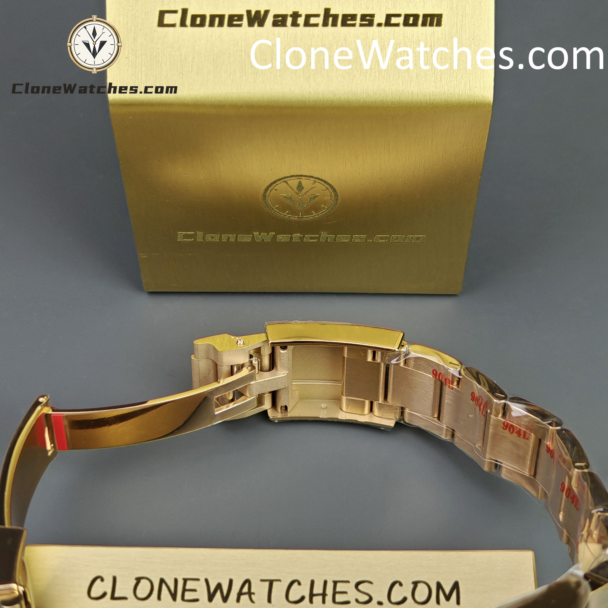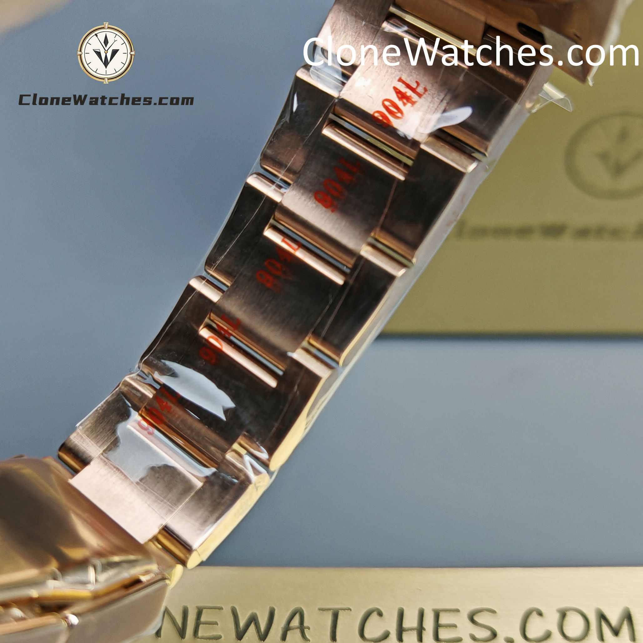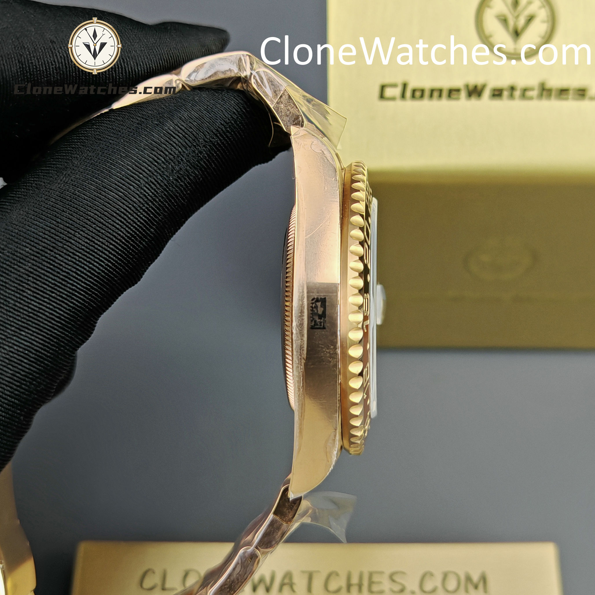 Constructed from 904L stainless steel with heavy 18K Rose Gold PVD plating. The color tone is warm and specifically tuned to match the oxidation-resistant Rolex “Everose.”