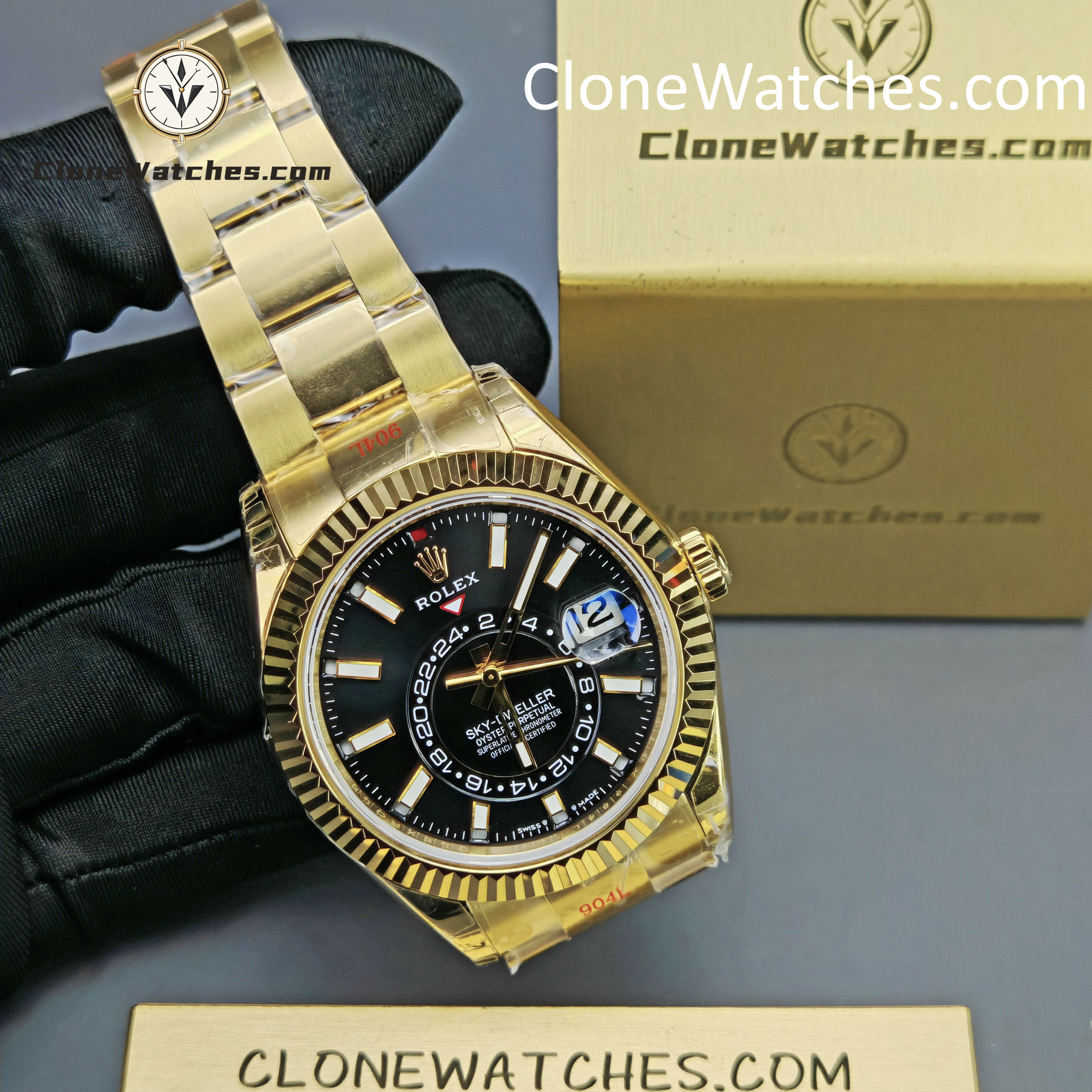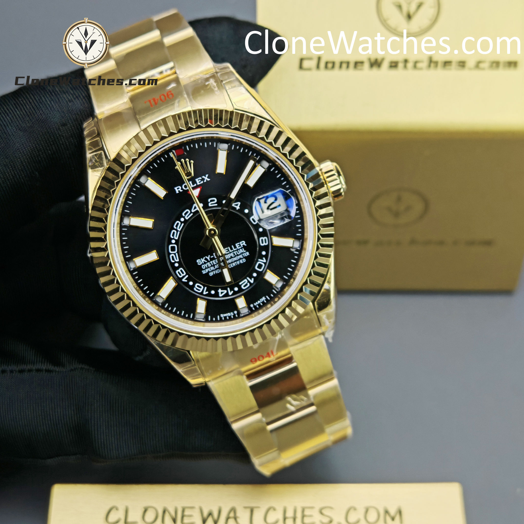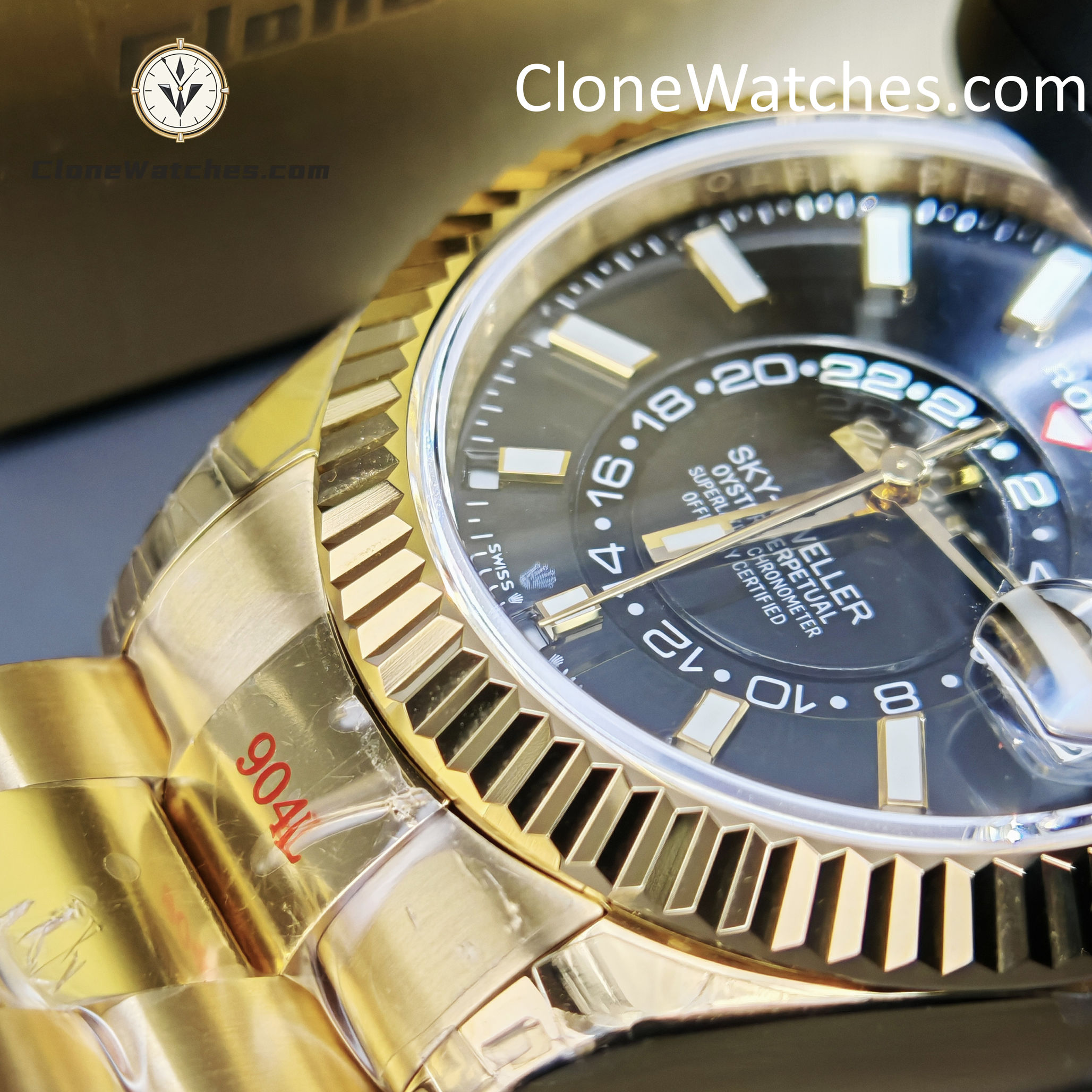 This super perfect Rolex Super Clone Watches is fully functional with 18k yellow gold plated on a 904L stainless steel case, solid case back with Rolex markings and engravings, Balck dial with center subdial for world time function.