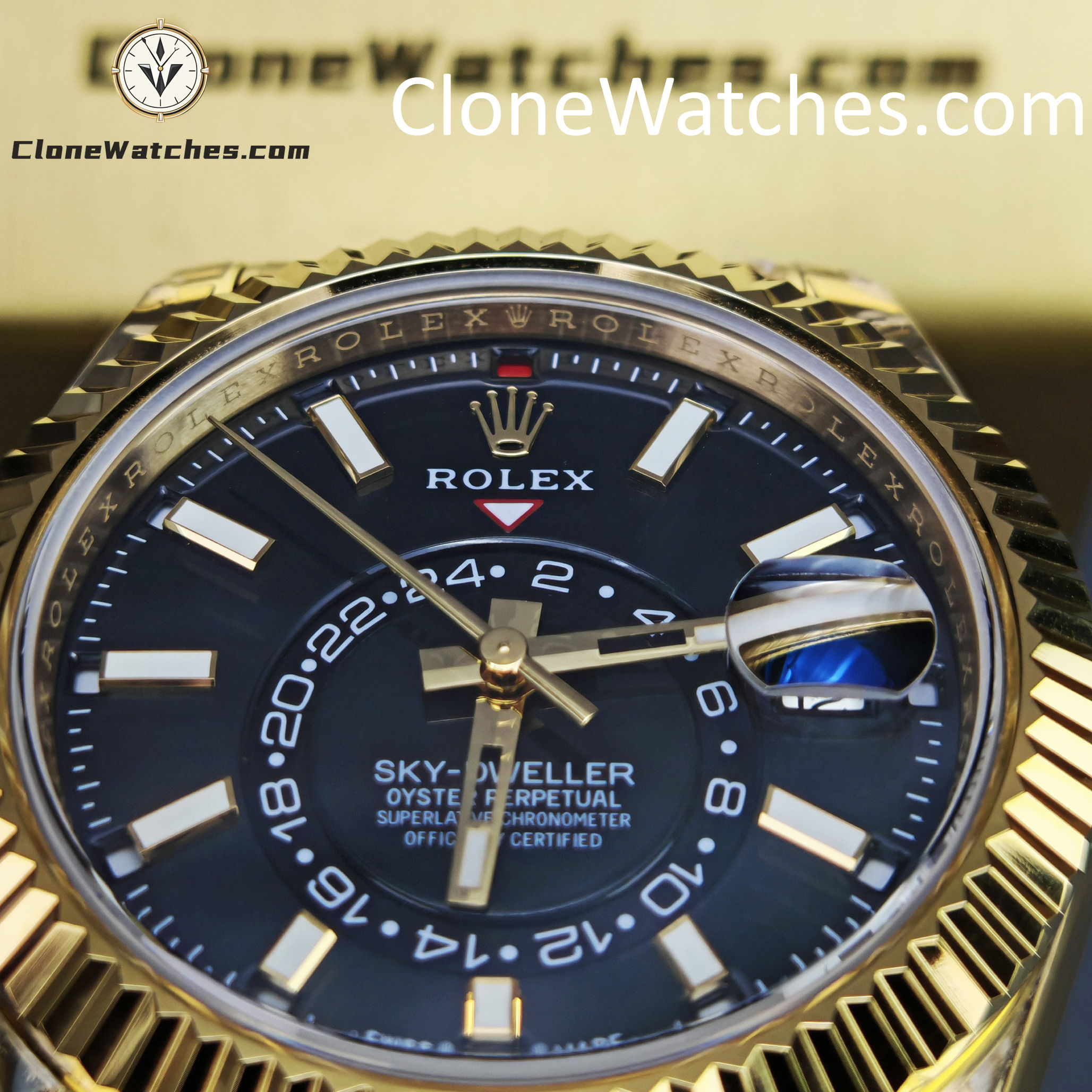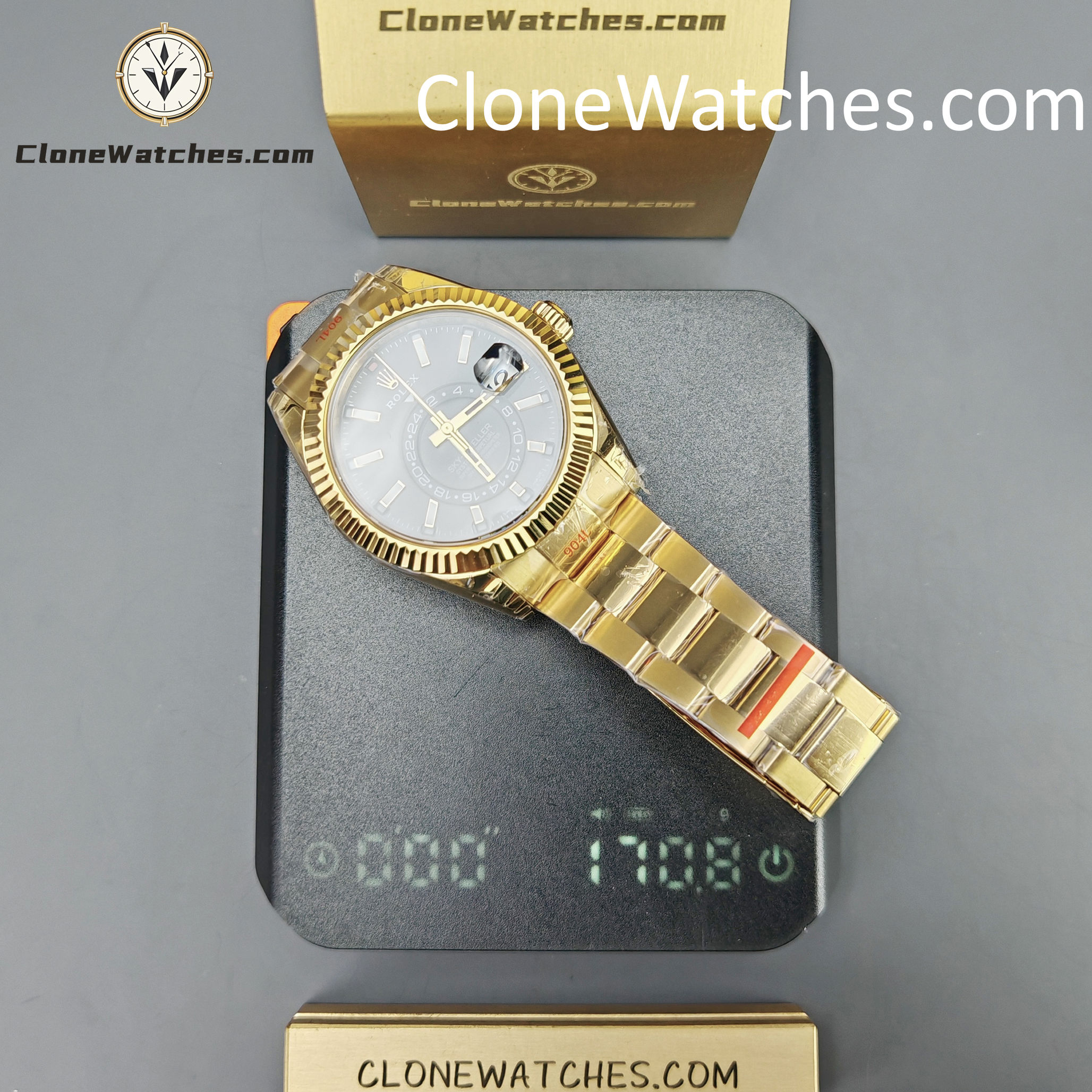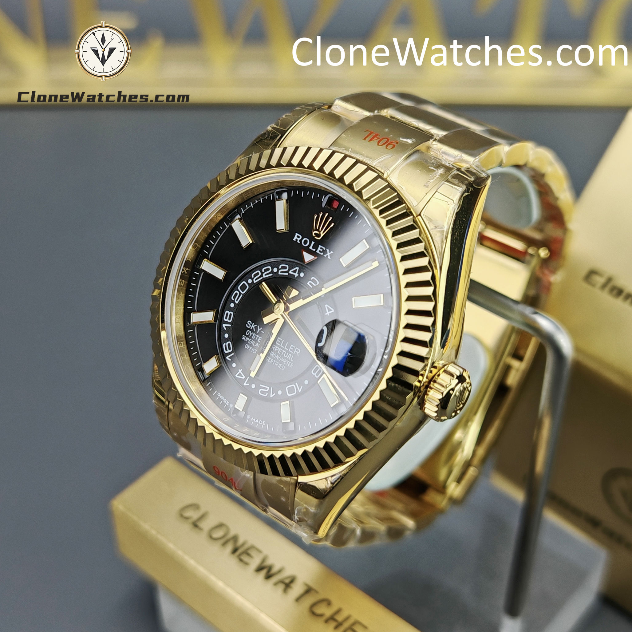 This super perfect Rolex Super Clone Watches is fully functional with 18k yellow gold plated on a 904L stainless steel case, solid case back with Rolex markings and engravings, Balck dial with center subdial for world time function.