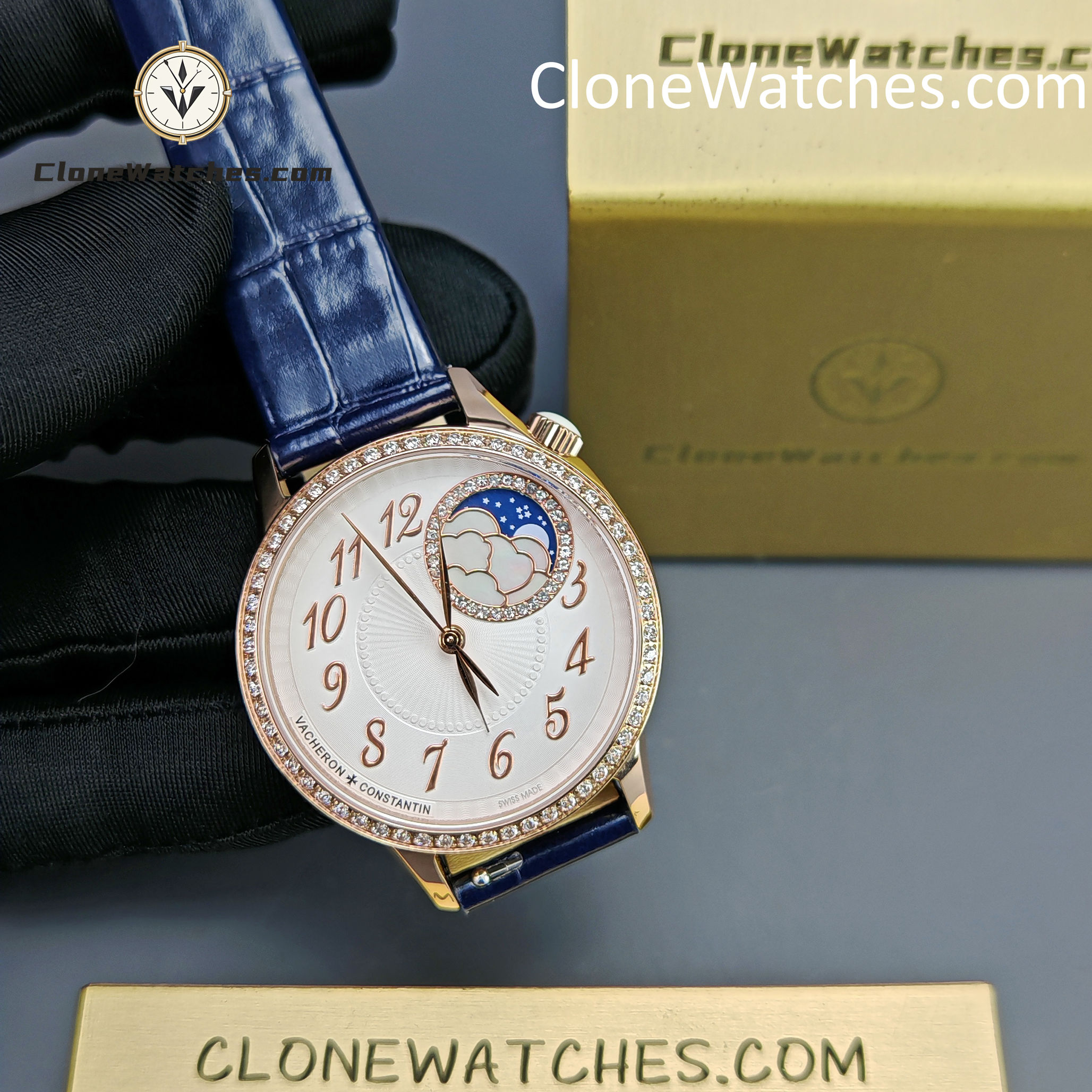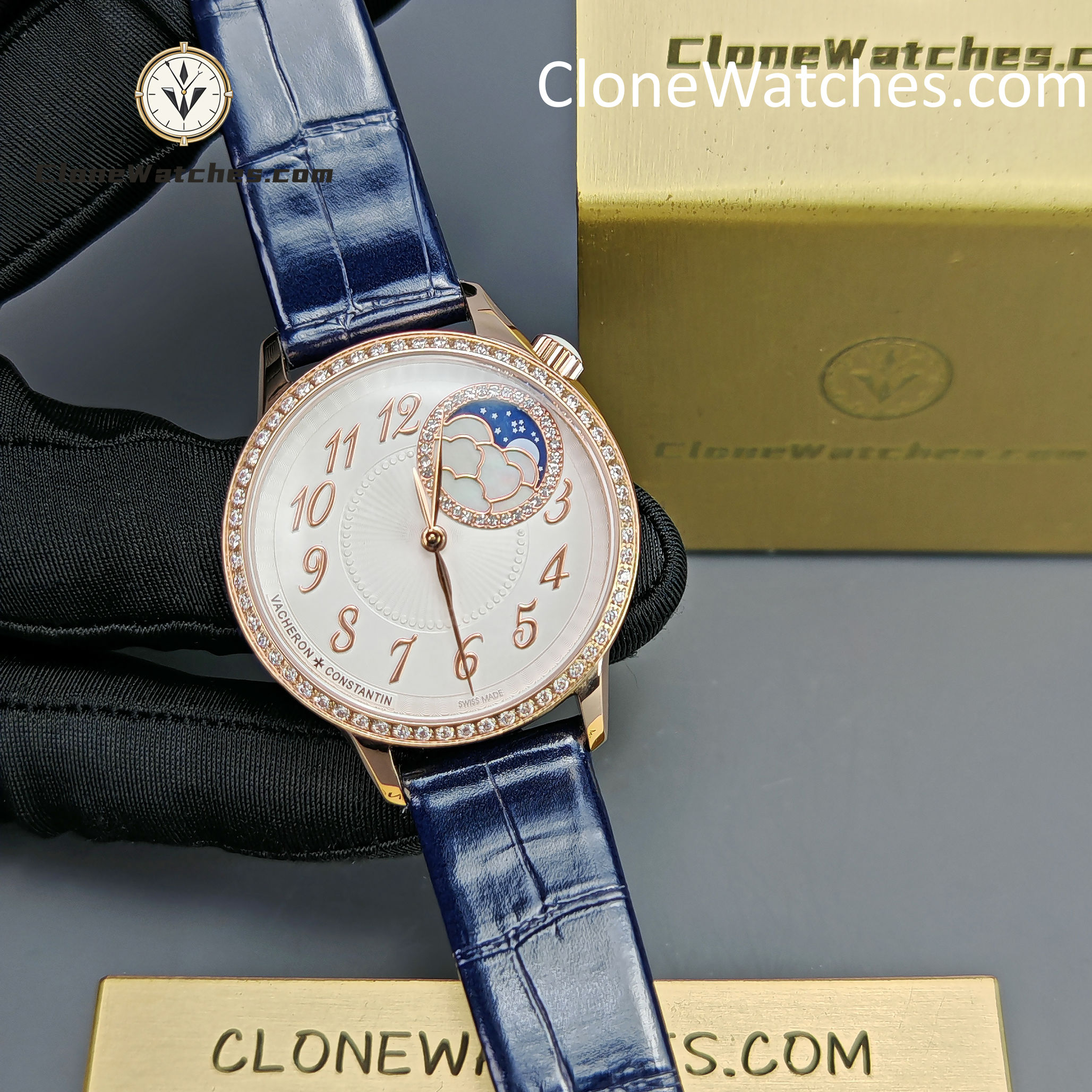 The crown of the Clone Watches is decorated with an arc-cut moonstone that symbolizes calmness and tranquility. The eccentric round dial with shining diamonds shows the time in a dreamy way, and the exquisite mother-of-pearl is carved into white clouds. With a diameter of 37 mm, it is equipped with a 1088L automatic winding movement, perfectly presenting the moon phase function. The elegant and luxurious design is specially made for connoisseurs.